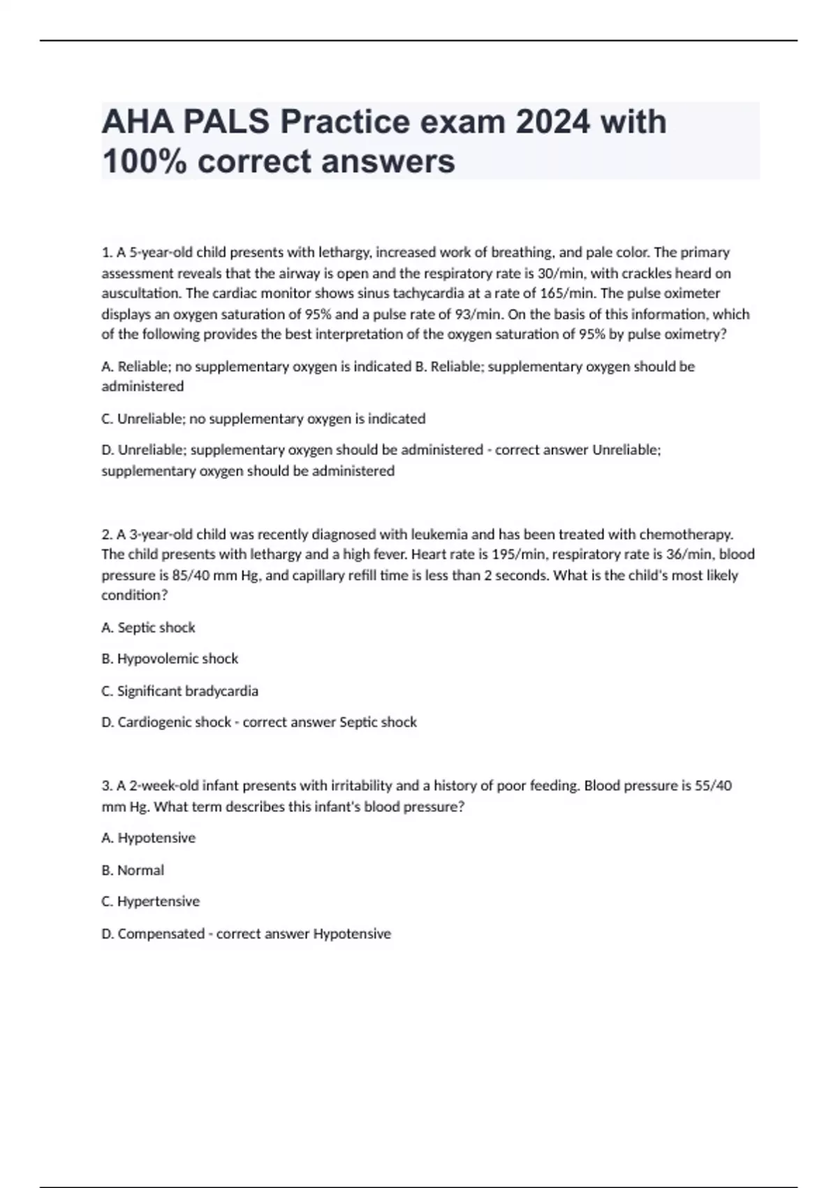 1. A 5-year-old child presents with lethargy, increased work of breathing, and pale color. The primary assessment reveals that the airway is open and the respiratory rate is 30/min, with crackles heard on auscultation. The cardiac monitor shows sinus tachycardia at a rate of 165/min. The pulse oximeter displays an oxygen saturation of 95% and a pulse rate of 93/min. On the basis of this information, which of the following provides the best interpretation of the oxygen saturation of 95% by pulse oximetry? A. Reliable; no supplementary oxygen is indicated B. Reliable; supplementary oxygen should be administered C. Unreliable; no supplementary oxygen is indicated D. Unreliable; supplementary oxygen should be administered - correct answer Unreliable; supplementary oxygen should be administered 2. A 3-year-old child was recently diagnosed with leukemia and has been treated with chemotherapy. The child presents with lethargy and a high fever. Heart rate is 195/min, respiratory rate is 36/min, blood pressure is 85/40 mm Hg, and capillary refill time is less than 2 seconds. What is the child's most likely condition? A. Septic shock B. Hypovolemic shock C. Significant bradycardia D. Cardiogenic shock - correct answer Septic shock 3. A 2-week-old infant presents with irritability and a history of poor feeding. Blood pressure is 55/40 mm Hg. What term describes this infant's blood pressure? A. Hypotensive B. Normal C. Hypertensive D. Compensated - correct answer Hypotensive 4. During a resuscitation attempt, the team leader orders an initial dose of epinephrine at 0.1 mg/kg to be given 10. What should the team member do? A. Administer the drug as ordered B. Administer 0.01 mg/kg of epinephrine C. Respectfully ask the team leader to clarify the dose D. Refuse to administer the drug - correct answer Respectfully ask the team leade