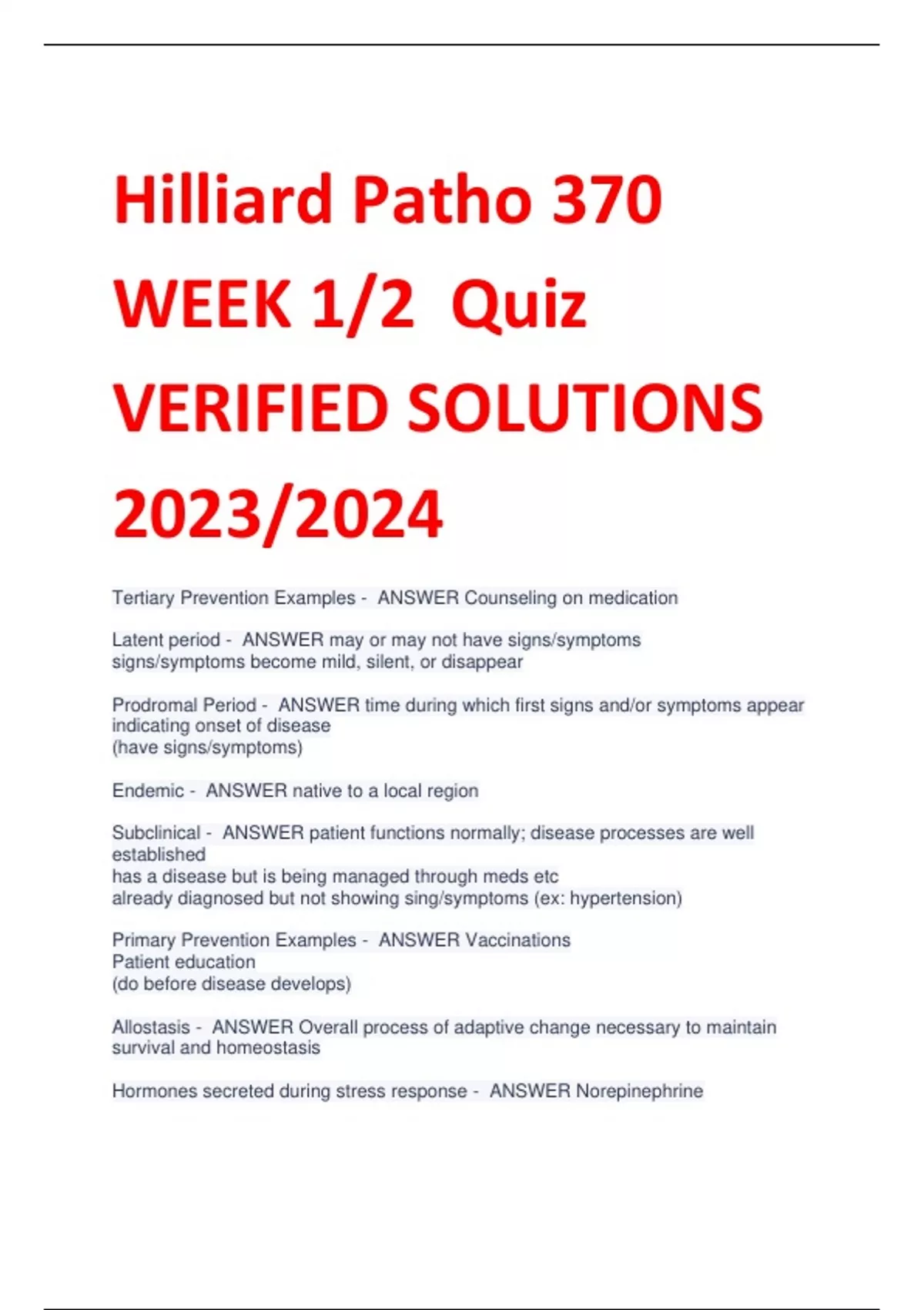 UPDATED Hilliard Patho 370 WEEK 1/2 Quiz VERIFIED SOLUTIONS 2023/2024