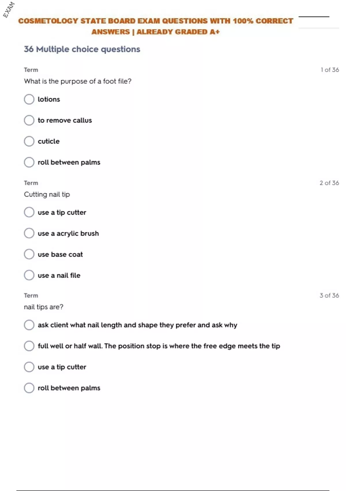 What is the purpose of a foot file? lotions to remove callus cuticle roll between palms 1 of 36 Term Cutting nail tip use a tip cutter use a acrylic brush use base coat use a nail file 2 of 36 Term nail tips are? ask client what nail length and shape they prefer and ask why full well or half wall. The position stop is where the free edge meets the tip use a tip cutter roll between palms 3 of 36 EXAM Term What Personal Protective Equipment should be used when applying nail primer? watch glass latex gloves safety equipment safety goggles 4 of 36 Term When performing a manicure, what step should we perform before shaping the nail? lye relaxers to dehydrate the nail remove polish making acrylic beads 5 of 36 Term Ideal shape for work nails? lotions nail bleach massage short squoval nails 6 of 36 EXAM Term What is Onychia and can it be treated in the salon? Why or why not? bitten nails/nail enhancements file the area and apply acrylic monomer and polymer nail bleach nail infection that must be referred to physician 7 of 36 Term What should you do if a client comes in with lifted nails? nail bleach lack of regular maintenance, too close to cuticle