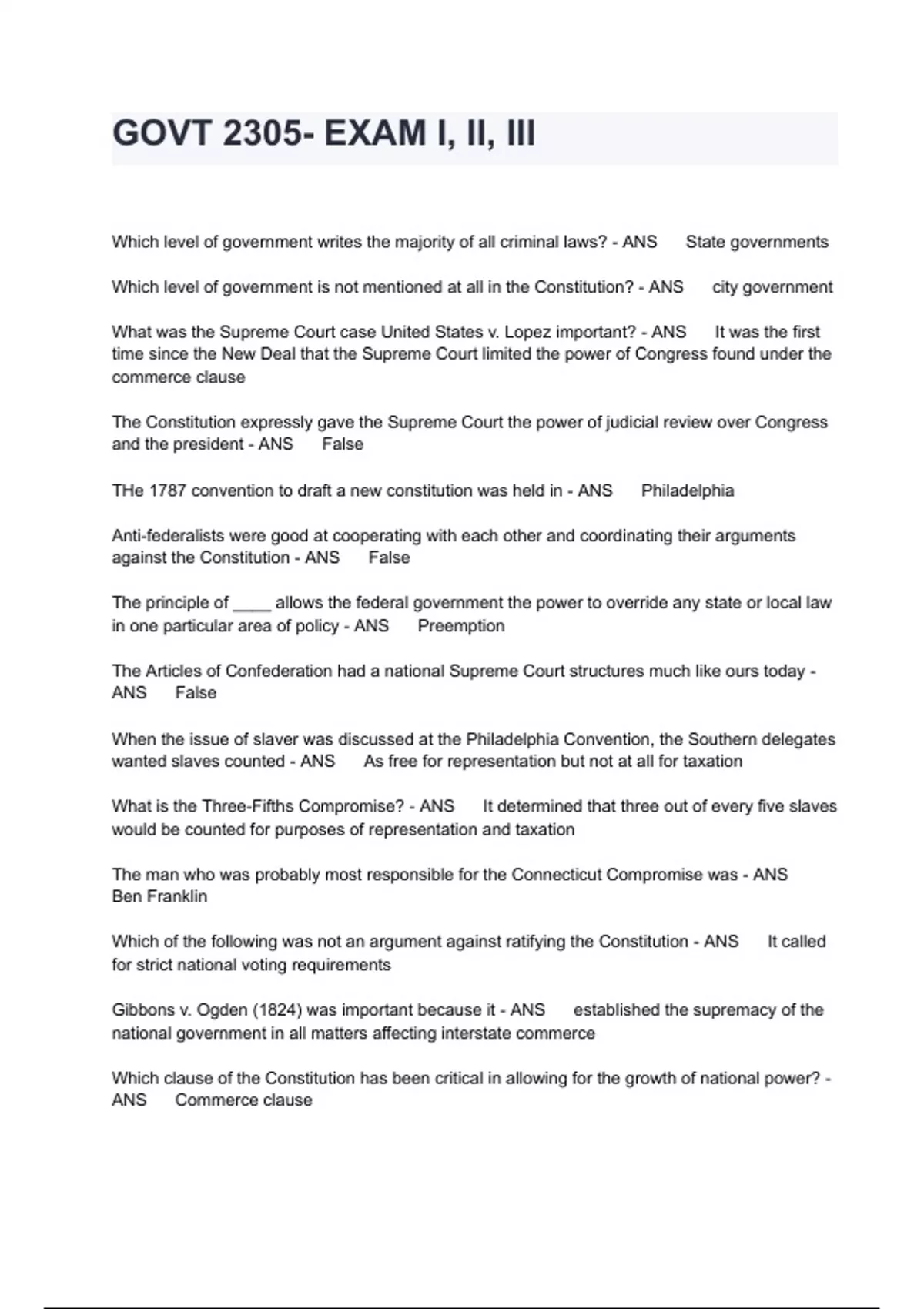 GOVT 2305- EXAM I, II, III(2024)GOVT 2305- EXAM I, II, III Which level of government writes the majority of all criminal laws? - ANS State governments Which level of government is not mentioned at all in the Constitution? - ANS city government What was the Supreme Court case United States v. Lopez important? - ANS It was the first time since the New Deal that the Supreme Court limited the power of Congress found under the commerce clause The Constitution expressly gave the Supreme Court the power of judicial review over Congress and the president - ANS False THe 1787 convention to draft a new constitution was held in - ANS Philadelphia Anti-federalists were good at cooperating with each other and coordinating their arguments against the Constitution - ANS False The principle of ____ allows the federal government the power to override any state or local law in one particular area of policy - ANS Preemption The Articles of Confederation had a national Supreme Court structures much like ours today - ANS False When the issue of slaver was discussed at the Philadelphia Convention, the Southern delegates wanted slaves counted - ANS As free for representation but not at all for taxation What is the Three-Fifths Compromise? - ANS It determined that three out of every five slaves would be counted for purposes of representation and taxation The man who was probably most responsible for the Connecticut Compromise was - ANS Ben Franklin Which of the following was not an argument against ratifying the Constitution - ANS It called for strict national voting requirements Gibbons v. Ogden (1824) was important because it - ANS established the supremacy of the national government in all matters affecting interstate commerce Which clause of the Constitution has been critical in allowing for the growth of national power? - ANS Commerce clause The Constitution intended to set rigid limits on the ___ level of governmet - ANS national Bicameralism is a constitutional principle that means - ANS division of Congress into two chambers Thomas Jefferson was an anti-federalist - ANS True Our government has changed from a system of ___ federalism when the Constitution first went into effect to a system of _____ federalism in our era - ANS dual, cooperative Why were states promised protection from invasion and riots? - ANS They were giving up their full-time armies so that the new central government could create one unified national army How has the structure of federalism allowed for the longevity of the US government? - ANS all of the above England let her American colonies govern themselves on a day to day basis because - ANS all of the above The Philadelphia Convention's economic expert was: - ANS Alexander Hamilton The main reason that the Articles government was usually bankrupt was: - ANS the Articles government couldn't force states to pay their taxes The Constitution allowed the ____ level of government to set voting requirements for its citizens - ANS state A marble cake accurately illustrates Cooperative Federalism - ANS True What was the purpose of the Annapolis Convention - ANS to discuss the weaknesses of the Articles of Confederation The leaders of most countries in the Colonial period were chosen by - ANS divine right of kings What did the New Jersey Plan propose for Congress? - ANS Representation would be equal for each state If the federal government compelled state governments to obey costly regulations but did not reimburse the costs, it is called a - ANS unfunded mandate During the Articles period, states could set their own foreign policy - ANS True Which event did the most to cause the rise of a more active national government? - ANS the Great Depression The Constitution delegated the power to coin money to the states - ANS False American colonists really didn't have a concept of being Americans until well after the Revolutionary War, and saw themselves mostly as British citizens of whichever colony they lived in - ANS True Federal officials seeking to give state governments more authority are most likely to support - ANS block grants The use of implied powers eroded the balance of power between the central and state governments that had been set up by the 10th Amendment - ANS true The Great Compromise led to the - ANS creation of a bicameral Congress The government in Washington was able to force states to lower their speed limits and raise their drinking ages by threatening to withhold a portion of each state's - ANS federal highway money When the federal government sets environmental standards that every state must follow, it is an example of - ANS regulated federalism States' reserved the powers are listed word for word in the Implied Powers clause of the Constitution - ANS False Under the Articles of Confederation, it was left to the ___ to execute the laws passed by Congress - ANS states Under the United States first constitution - ANS there was no president The supreme law in the United States is/are the - ANS US Constitution What have many political scientists called laboratories of democracy - ANS the states Which of the following was not a way the framers tried to make the Senate a check against excessive democracy - ANS Senators are the only officials immune from impeachment The central government promised states that it would not seize their land by guaranteeing - ANS territorial integrity How was power in Congress divided under the Articles of Confederation? - ANS Each state had an equal vote What is the main purpose behind the privileges and immunities clause of Article IV? - ANS It prevents a state from giving special favors to its own residents or discriminating against nonresident If a state grants a city the ability to govern its own local affairs, this delegation of power is known as - ANS home rule Which of the following was not one of the writers of the Federalist Papers - ANS John Adams Shays Rebellion was significant because it - ANS convinced many observers that the gover