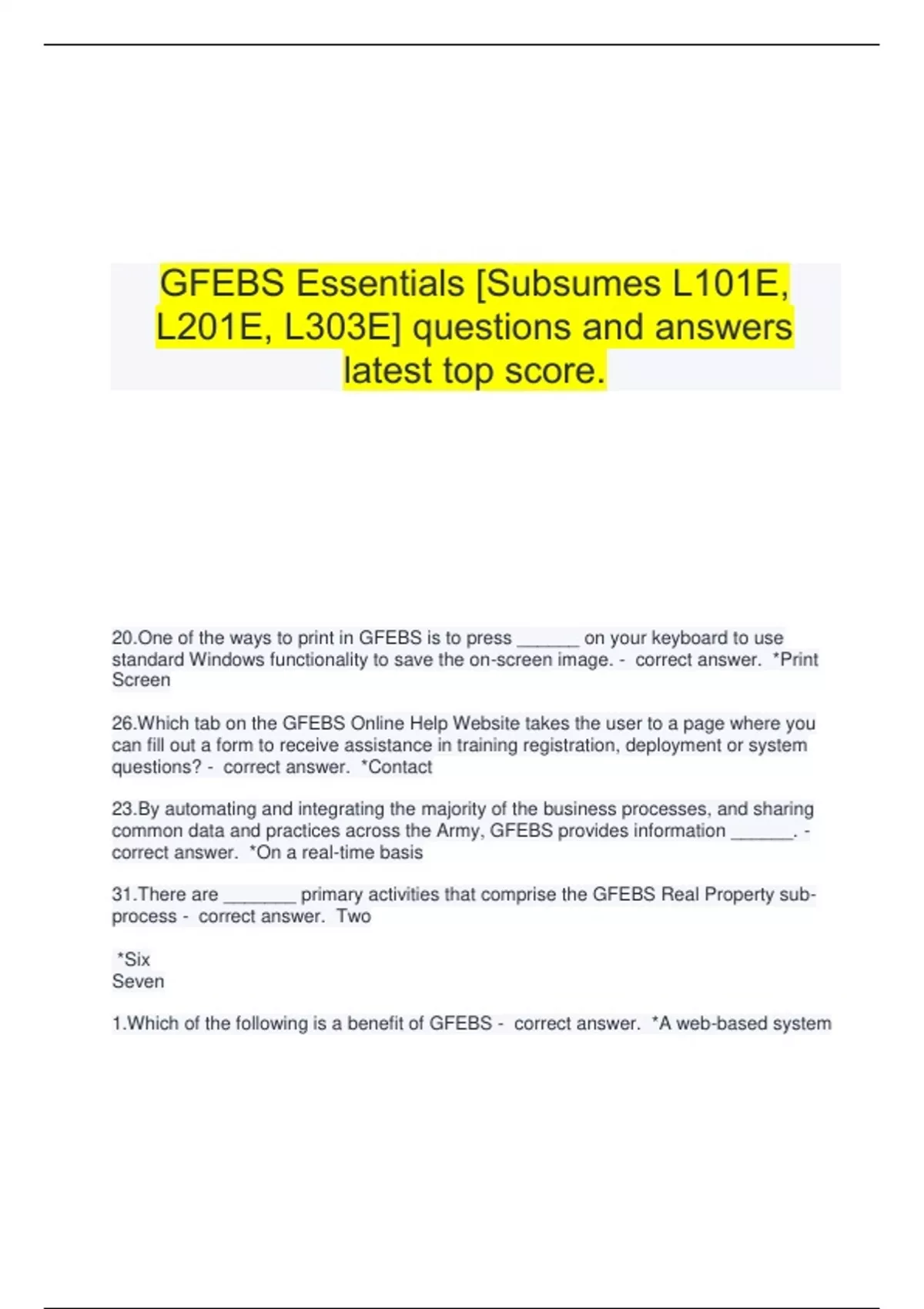 GFEBS Essentials [Subsumes L101E, L201E, L303E] questions and answers latest top score. 20.One of the ways to print in GFEBS is to press ______ on your keyboard to use standard Windows functionality to save the on-screen image. - correct answer. *Print Screen 26.Which tab on the GFEBS Online Help Website takes the user to a page where you can fill out a form to receive assistance in training registration, deployment or system questions? - correct answer. *Contact 23.By automating and integrating the majority of the business processes, and sharing common data and practices across the Army, GFEBS provides information ______. - correct answer. *On a real-time basis 31.There are _______ primary activities that comprise the GFEBS Real Property sub-process - correct answer. Two *Six Seven 1.Which of the following is a benefit of GFEBS - correct answer. *A web-based system 13._______ systems are management information systems that integrate and automate many of the business practices associated with the operations or production aspects of a company - correct answer. Financial Planning *Enterprise Resource Planning Exact Return Performance Fundamental Procedure 27.GFEBS provides _______. - correct answer. financial, asset, accounting and cost data The authority to bypass regulations when not a system requirement Automated Army, Air force, and Navy financial reports integration 7.GFEBS uses the ERP program SAP, which provides _______. - correct answer. A common data structure Automated accounting transaction corrections 28.What areas are included in Property, Plant, and Equipment (PP&E)? - correct answer. *All of the above 16.GFEBS strategically supports and improves the current Department of Defense (DoD) Business Enterprise Architecture by providing functionality that supports various business components which include all of the following except: - correct answer. Acquisitions Installations and Environment *Strategic planning and budgeting 14.Which of the following activities fall within the Reimbursables business process area? - correct answer. *All of the above 35.What is a type of Real Property? - correct answer. *Office Buildings Plant Equipment None of the above 37.The ____ is used to set standard default information for specific fields when the user is setup in GFEBS. This information is used to identify specific functions or activities related to the user. - correct answer. *Paramters tab 2.The _____ escalated the need for federal financial management systems to provide accurate, reliable, and timely financial management information to the government's highest levels. - correct answer. *Federal Financial Management Improvement Act 22.What button do you click on to cancel a transaction - correct answer. *Cancel