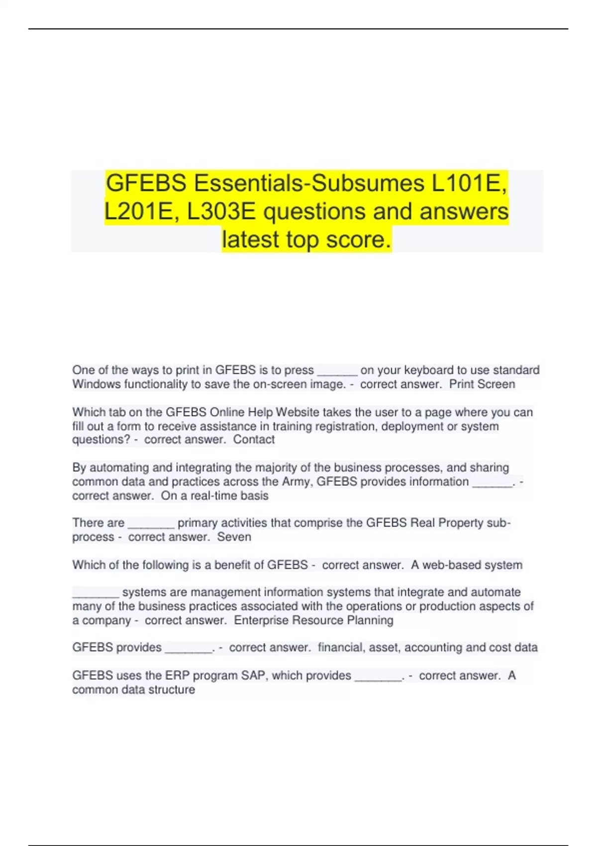 GFEBS Essentials-Subsumes L101E, L201E, L303E questions and answers latest top score.