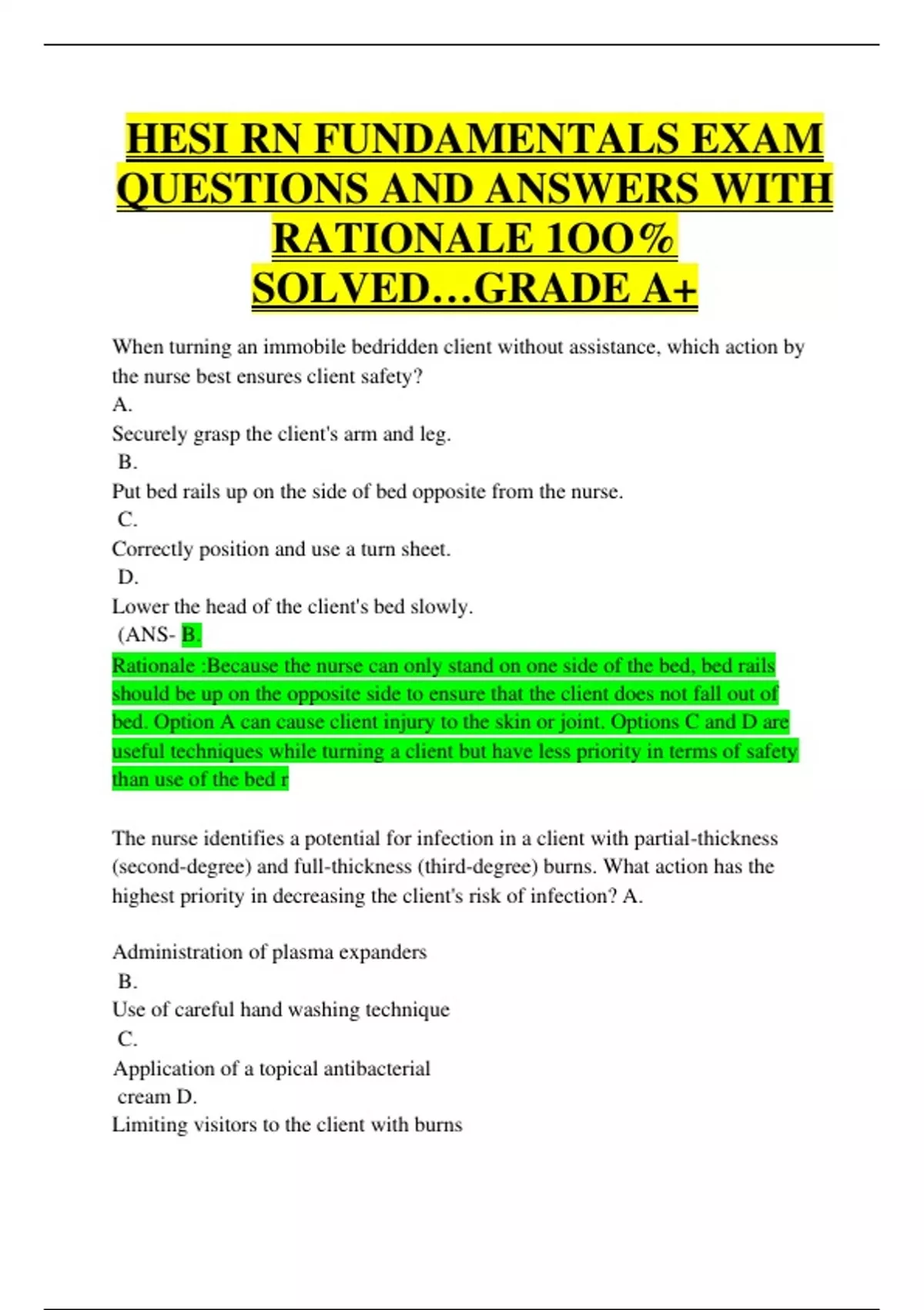 HESI RN FUNDAMENTALS EXAM QUESTIONS AND ANSWERS WITH RATIONALE 1OO% SOLVED…GRADE A+ When turning an immobile bedridden client without assistance, which action by the nurse best ensures client safety? A. Securely grasp the client's arm and leg. B. Put bed rails up on the side of bed opposite from the nurse. C. Correctly position and use a turn sheet. D. Lower the head of the client's bed slowly. (ANS- B. Rationale :Because the nurse can only stand on one side of the bed, bed rails should be up on the opposite side to ensure that the client does not fall out of bed. Option A can cause client injury to the skin or joint. Options C and D are useful techniques while turning a client but have less priority in terms of safety than use of the bed r