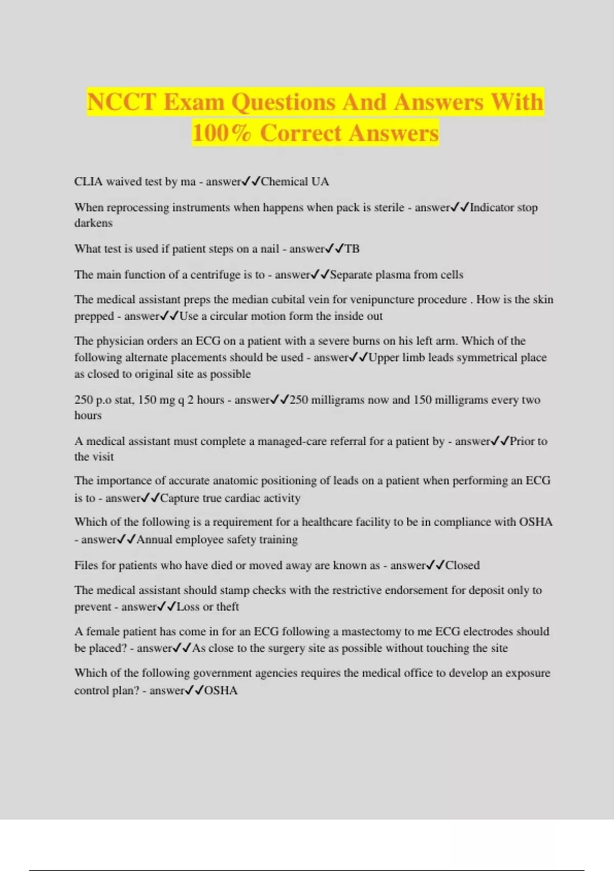 NCCT Exam Questions And Answers With 100% Correct Answers CLIA waived test by ma - answerChemical UA When reprocessing instruments when happens when pack is sterile - answerIndicator stop darkens What test is used if patient steps on a nail - answerTB The main function of a centrifuge is to - answerSeparate plasma from cells The medical assistant preps the median cubital vein for venipuncture procedure . How is the skin prepped - answerUse a circular motion form the inside out The physician orders an ECG on a patient with a severe burns on his left arm. Which of the following alternate placements should be used - answerUpper limb leads symmetrical place as closed to original site as possible 250 p.o stat, 150 mg q 2 hours - answer250 milligrams now and 150 milligrams every two hours A medical assistant must complete a managed-care referral for a patient by - answerPrior to the visit The importance of accurate anatomic positioning of leads on a patient when performing an ECG is to - answerCapture true cardiac activity Which of the following is a requirement for a healthcare facility to be in compliance with OSHA - answerAnnual employee safety training Files for patients who have died or moved away are known as - answerClosed The medical assistant should stamp checks with the restrictive endorsement for deposit only to prevent - answerLoss or theft A female patient has come in for an ECG following a mastectomy to me ECG electrodes should be placed? - answerAs close to the surgery site as possible without touching the site Which of the following government agencies requires the medical office to develop an exposure control plan? - answerOSHA The medical assistant schedules the patient with us system for an incision and drainage which of the following statements describes the procedure? - answerIncision into a localized area of infection to drain the exudate from th