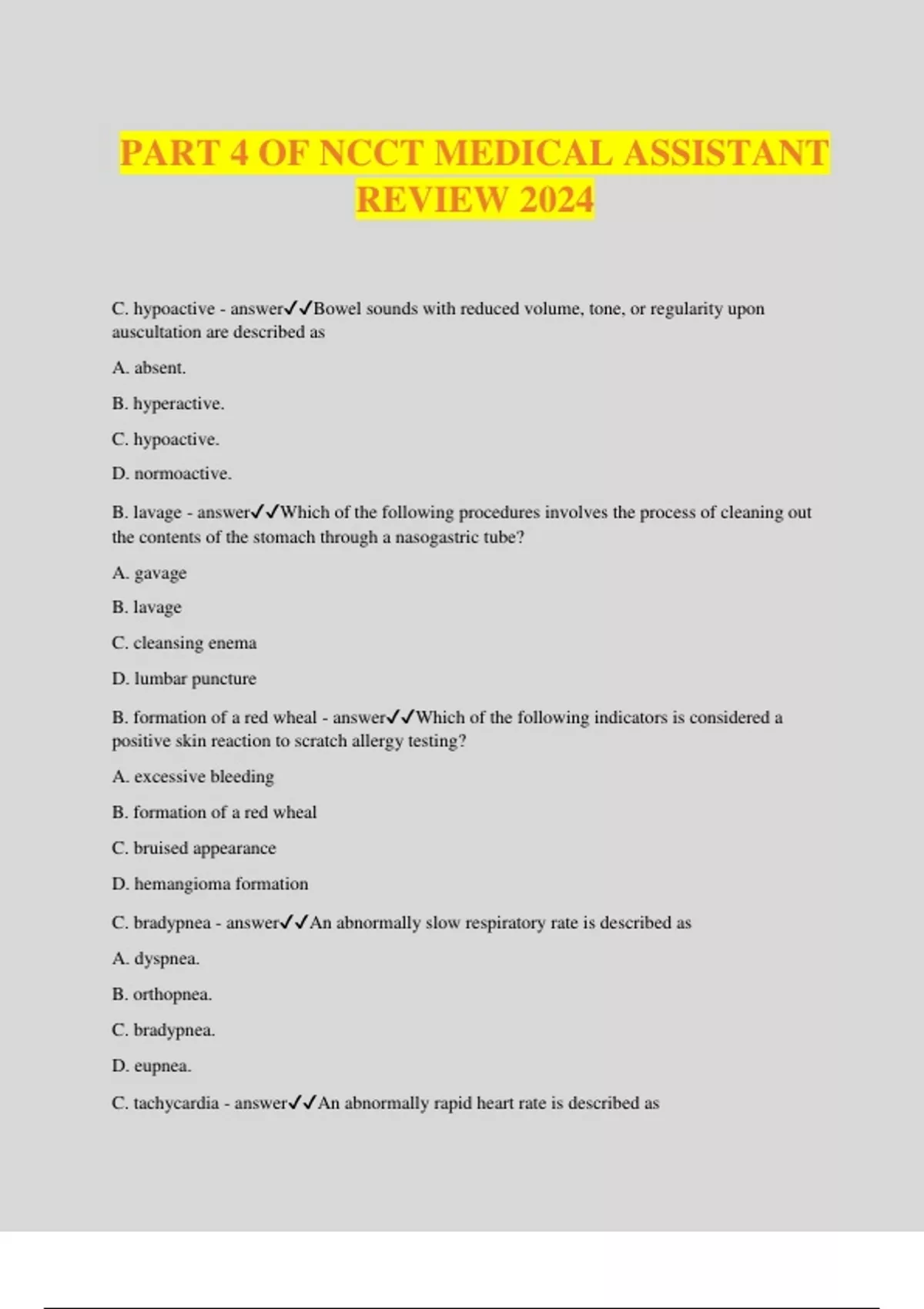 PART 4 OF NCCT MEDICAL ASSISTANT REVIEW 2024 C. hypoactive - answerBowel sounds with reduced volume, tone, or regularity upon auscultation are described as A. absent. B. hyperactive. C. hypoactive. D. normoactive. B. lavage - answerWhich of the following procedures involves the process of cleaning out the contents of the stomach through a nasogastric tube? A. gavage B. lavage C. cleansing enema D. lumbar puncture B. formation of a red wheal - answerWhich of the following indicators is considered a positive skin reaction to scratch allergy testing? A. excessive bleeding B. formation of a red wheal C. bruised appearance D. hemangioma formation C. bradypnea - answerAn abnormally slow respiratory rate is described as A. dyspnea. B. orthopnea. C. bradypnea. D. eupnea. C. tachycardia - answerAn abnormally rapid heart rate is described as A. hypertension. B. tachypnea. C. tachycardia. D. hyperplasia. A. xerosis - answerAbnormally dry skin is described as A. xerosis. B. vitiligo. C. excoriation. D. ecchymosis. D. hypertension - answerThe medical assistant measures a patient's b/p in the left upper arm at 188/110 mm Hg. This reading is consistent with A. hyperplasia. B. tachycardia. C. hyperthermia. D. hypertension. C. extension - answerWhen observing a patient's range of motion of the right ankle, which term describes the ability to point their toes? A. abduction B. adduction C. extension D. flexion A. hypertension - answerThe medical assistant measures the patient's blood pressure in the office. The reading is 220/88 mmHg.