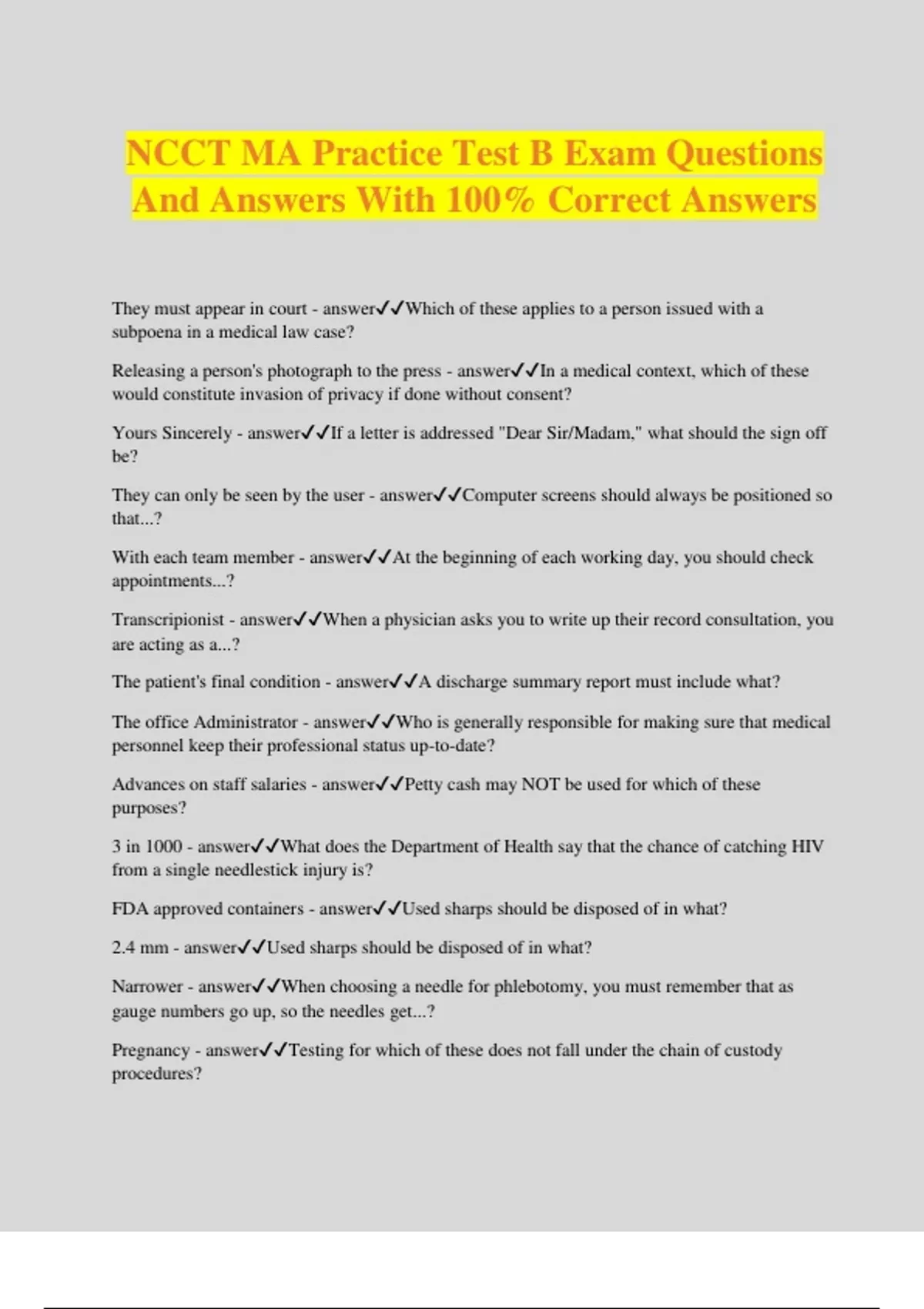 NCCT MA Practice Test B Exam Questions And Answers With 100% Correct Answers They must appear in court - answerWhich of these applies to a person issued with a subpoena in a medical law case? Releasing a person's photograph to the press - answerIn a medical context, which of these would constitute invasion of privacy if done without consent? Yours Sincerely - answerIf a letter is addressed "Dear Sir/Madam," what should the sign off be? They can only be seen by the user - answerComputer screens should always be positioned so that...? With each team member - answerAt the beginning of each working day, you should check appointments...? Transcripionist - answerWhen