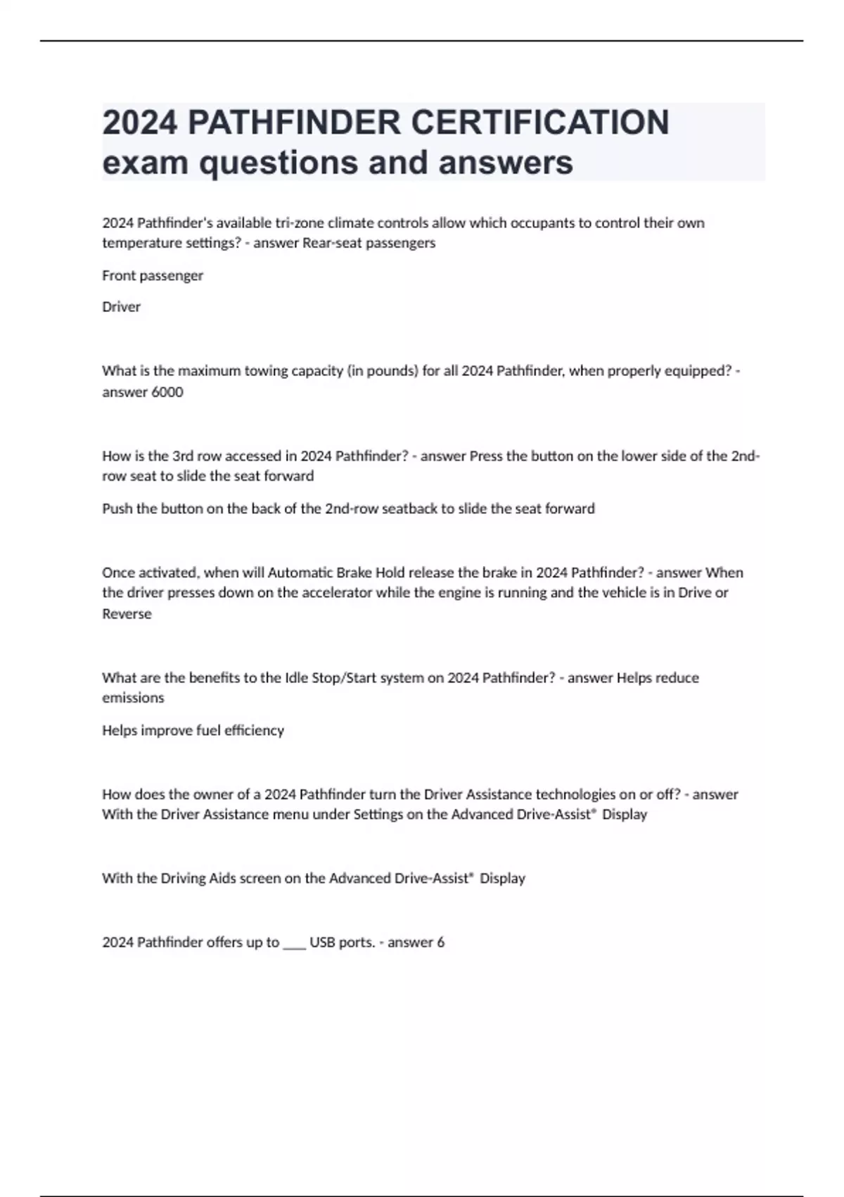 2024 Pathfinder's available tri-zone climate controls allow which occupants to control their own temperature settings? Rear-seat passengers Front passenger Driver What is the maximum towing capacity (in pounds) for all 2024 Pathfinder, when properly equipped? 6000 How is the 3rd row accessed in 2024 Pathfinder? Press the button on the lower side of the 2nd-row seat to slide the seat forward Push the button on the back of the 2nd-row seatback to slide the seat forward Once activated, when will Automatic Brake Hold release the brake in 2024 Pathfinder? When the driver presses down on the accelerator while the engine is running and the vehicle is in Drive or Reverse What are the benefits to the Idle Stop/Start system on 2024 Pathfinder? Helps reduce emissions Helps improve fuel efficiency How does the owner of a 2024 Pathfinder turn the Driver Assistance technologies on or off? With the Driver Assistance menu under Settings on the Advanced Drive-Assist® Display With the Driving Aids screen on the Advanced Drive-Assist® Display 2024 Pathfinder offers up to ___ USB ports. 6 What is the advantage of 2024 Pathfinder's available power liftgate garage mode? Liftgate opens only to a user-selected height for low-clearance situations How is 2024 Pathfinder's available motion-activated liftgate operated? In-and-out kicking motion under the center of the rear bumper When does the Intelligent Around View® Monitor (A-IVM) with Off-Road Mode automatically turn on in 2024 Pathfinder Rock Creek Edition models? When the Drive and Terrain Mode Selector is moved into Sand or Mud/Rut mode With 2024 Pathfinder's available 4-door capacitive request switches, what happens when a user holding an Intelligent Key double-presses any of the switches? All four doors unlock What happens when the standard rear or available front sonar sensors detect that an obstacle is less than 10 inches away when 2024 Pathfinder is in Drive or Reverse? The beeping sound becomes a continuous tone What two additional drive modes are available in 4WD 2024 Pathfinder models? Mud/Rut mode Sand mode When demonstrating 2024 Pathfinder's EZ Flex™ Seating system, how do you adjust the 2nd-row seatback? Lift the lever on the side of the seat cushion to lay the seatback flat for cargo purposes Pull up on the lever on the side of the seat cushion How long will 2024 Pathfinder's hill start assist feature hold the brakes on a hill? Approximately 2 seconds or until the accelerator pedal is pressed What are the benefits of 2024 Pathfinder's 9-speed automatic transmission? Quick, strong response when accelerating from a stop Dynamic performance with fuel efficiency What action can Trailer Sway Control take when Vehicle Dynamic Control sensors detect side-to-side swaying of the trailer on 2024 Pathfinder? Applies braking to individual wheels 2024 Pathfinder's available hill descent control helps the driver maintain a controlled speed without having to use the brakes when ________. Going down steep slopes at slow speeds Which of the following statements are true of 2024 Pathfinder's 2nd-row seats? Both sides feature LATCH AND GLIDE™ technology The seatbacks recline Bench seat configuration is 60/40 split folding There are available captain's chairs The seats can slide and tilt forward What is the advantage of the available middle stop function of 2024 Pathfinder's power liftgate? Allows user to stop the liftgate at an intermediate position when opening What are the advantages of 2024 Pathfinder's available reverse synchronized tilt-down outside mirrors? The mirrors will tilt down automatically when vehicle is in Reverse Provide a view next to the vehicle Which of the following features help define 2024 Pathfinder's rugged character? 18- or 20-inch wheels and tires LED headlights Large chrome V-Motion grille Muscular fenders What is the size (in inches) of the largest available digital display on 2024 Pathfinder? 12.3 When does 2024 Pathfinder's electronic parking brake automatically engage? When the vehicle is turned off 2024 Pathfinder offers an available dual panoramic moonroof that provides a view for occupants in ________. 1st and 2nd rows only How does 2024 Pathfinder provide more control when hauling or towing heavy loads when in Tow mode? By reducing transmission shifts What are the advantages of Direct Injection Gasoline (DIG) used in 2024 Pathfinder's engine? Reduces exhaust emissions Increases fuel efficiency Enhances engine power .Once activated, when will Automatic Brake Hold release the brake in 2024 Pathfinder? When the driver presses down on the accelerator while the engine is running and the vehicle is in Drive or Reverse How does 2024 Pathfinder's Drive Mode Selector change the vehicle's performance when in Snow mode? Controls power output and engine characteristics for driving on slippery surfaces Using the electronic shifter in 2024 Pathfinder, how do you shift the vehicle into Drive? Move the shift lever rearward past the stop point Where is the available front central seat-mounted supplemental air bag located on 2024 Pathfinder? In the driver's side bolster area on the side closest to the center of the vehicle