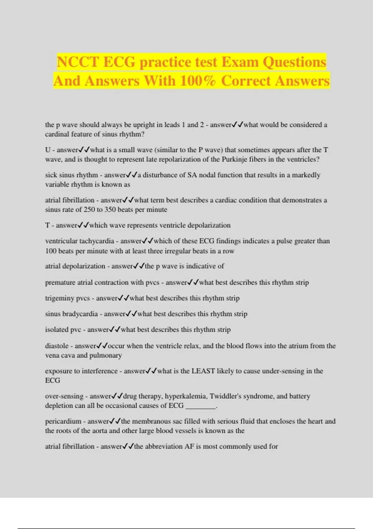 NCCT ECG practice test Exam Questions And Answers With 100% Correct Answers the p wave should always be upright in leads 1 and 2 - answerwhat would be considered a cardinal feature of sinus rhythm? U - answerwhat is a small wave (similar to the P wave) that sometimes appears after the T wave, and is thought to represent late repolarization of the Purkinje fibers in the ventricles? sick sinus rhythm - answera disturbance of SA nodal function that results in a markedly variable rhythm is known as atrial fibrillation - answerwhat term best describes a cardiac condition that demonstrates a sinus rate of 250 to 350 beats per minute T - answerwhich wave represents ventricle depolarization ventricular tachycardia - answerwhich of these ECG findings indicates a pulse greater than 100 beats per minute with at least three irregular beats in a row atrial depolarization - answerthe p wave is indicative of premature atrial contraction with pvcs - answerwhat best describes this rhythm strip trigeminy pvcs - answerwhat best describes this rhythm strip sinus bradycardia - answerwhat best describes this rhythm strip isolated pvc - answerwhat best describes this rhythm strip diastole - answeroccur when the ventricle relax, and the blood flows into the atrium from the vena cava and pulmonary exposure to interference - answerwhat is the LEAST likely to cause under-sensing in the ECG over-sensing - answerdrug therapy, hyperkalemia, Twiddler's syndrome, and battery depletion can all be occasional causes of ECG