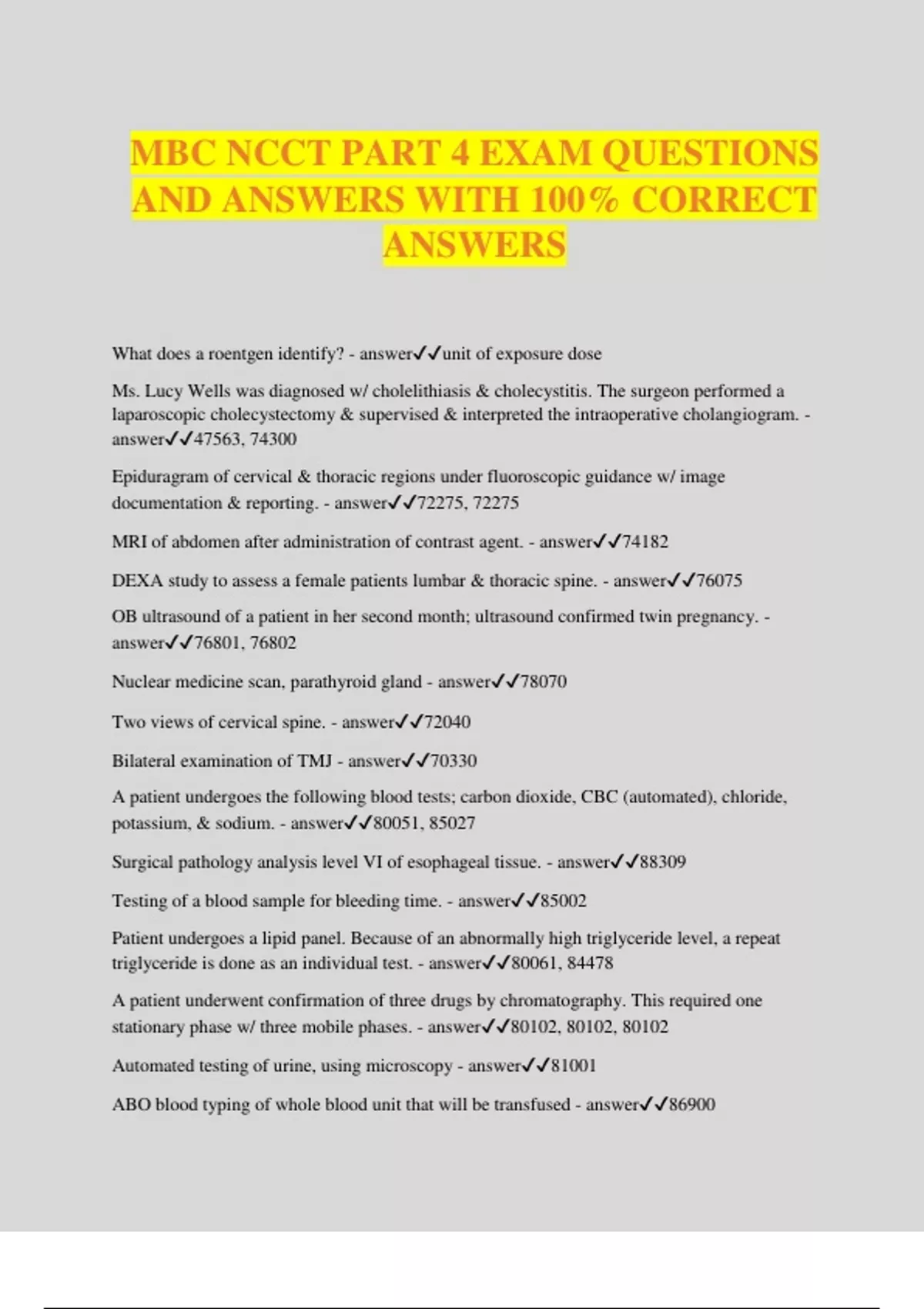MBC NCCT PART 4 EXAM QUESTIONS AND ANSWERS WITH 100% CORRECT ANSWERS What does a roentgen identify? - answerunit of exposure dose Ms. Lucy Wells was diagnosed w/ cholelithiasis & cholecystitis. The surgeon performed a laparoscopic cholecystectomy & supervised & interpreted the intraoperative cholangiogram. - answer47563, 74300 Epiduragram of cervical & thoracic regions under fluoroscopic guidance w/ image documentation & reporting. - answer72275, 72275 MRI of abdomen after administration of contrast agent. - answer74182 DEXA study to assess a female patients lumbar & thoracic spine. - answer76075 OB ultrasound of a patient in her second month; ultrasound confirmed twin pregnancy. - answer76801, 76802 Nuclear medicine scan, parathyroid gland - answer78070 Two views of cervical spine. - answer72040 Bilateral examination of TMJ - answer70330 A patient undergoes the following blood tests; carbon dioxide, CBC (automated), chloride, potassium, & sodium. - answer80051, 85027 Surgical pathology analysis level VI of esophageal tissue. - answer88309 Testing of a blood sample for bleeding time. - answer85002 Patient undergoes a lipid panel. Because of an abnormally high triglyceride level, a repeat triglyceride is done as an individual test. - answer80061, 84478 A patient underwent confirmation of three drugs by chromatography. This required one stationary phase w/ three mobile phases. - answer80102, 80102, 80102 Automated testing of urine, using microscopy - answer81001 ABO blood typing of whole blood unit that will be transfused - answer86900 Nicole Miller had blood testing done to determine peroxidase activity, qualitative, feces. This was of a specimen obtained from a digital rectal exam (DRE) - answer82272 C peptide panel - answer80432 Analysis of semen for presence & morbidity - answer89321 Pathology examination of tissue removed during a pancreas biopsy - answer88307 Testing of blood for presence of Bordetella antibody - answer86615 Complete autopsy of a 35 yr. old man found dead in his car in the parking lot of a convenience store. - answer88027 Fitting of single vision eyeglasses - answer92340 A patient, Colin Edwards, had a cochlear implant inserted eight months ago. Today Colin, who is 8 yr. old, requires reprogramming of this device. - answer92604 Ventilator management performed on May 6 & May 7 - answer94656, 94657 A 12 yr. old patient received interactive psychiatric diagnostic interview & exam. services after she reported that she as being teased & "picked on" at school. - answer90802 A 17 yr. old patient received an IM injection of HPV vaccine type 11. - answer90471, 90649 Patient underwent active wound care management that involved the removal of devitalized tissue from burn wounds w/ nonselective debridement & application of wet-to-moist dressings. Wound assessment & instructions for ongoing care were also provided during the session. - answer97602 CMT of cervical, thoracic, & lumbar regions. - answer98941 A patient diagnosed w/ asthma was provided w/ respiratory care about the correct usage of a bronchodilator. This service is provided in the patient's home. - answer99503 A 65 yr. old male patient underwent a left heart retrograge catheterization, which was preceded by insertion of a Swan-Ganz catherter. The heart catheterization was started via puncture of the femoral artery. Left ventricular & selective coronary angiographies were also performed. - answer93510, 93543, 93545, 93555, 93556 On September 8 & September 17, William James received outpatient cardiac rehabilitation services provided by Dr. Scott. The servic