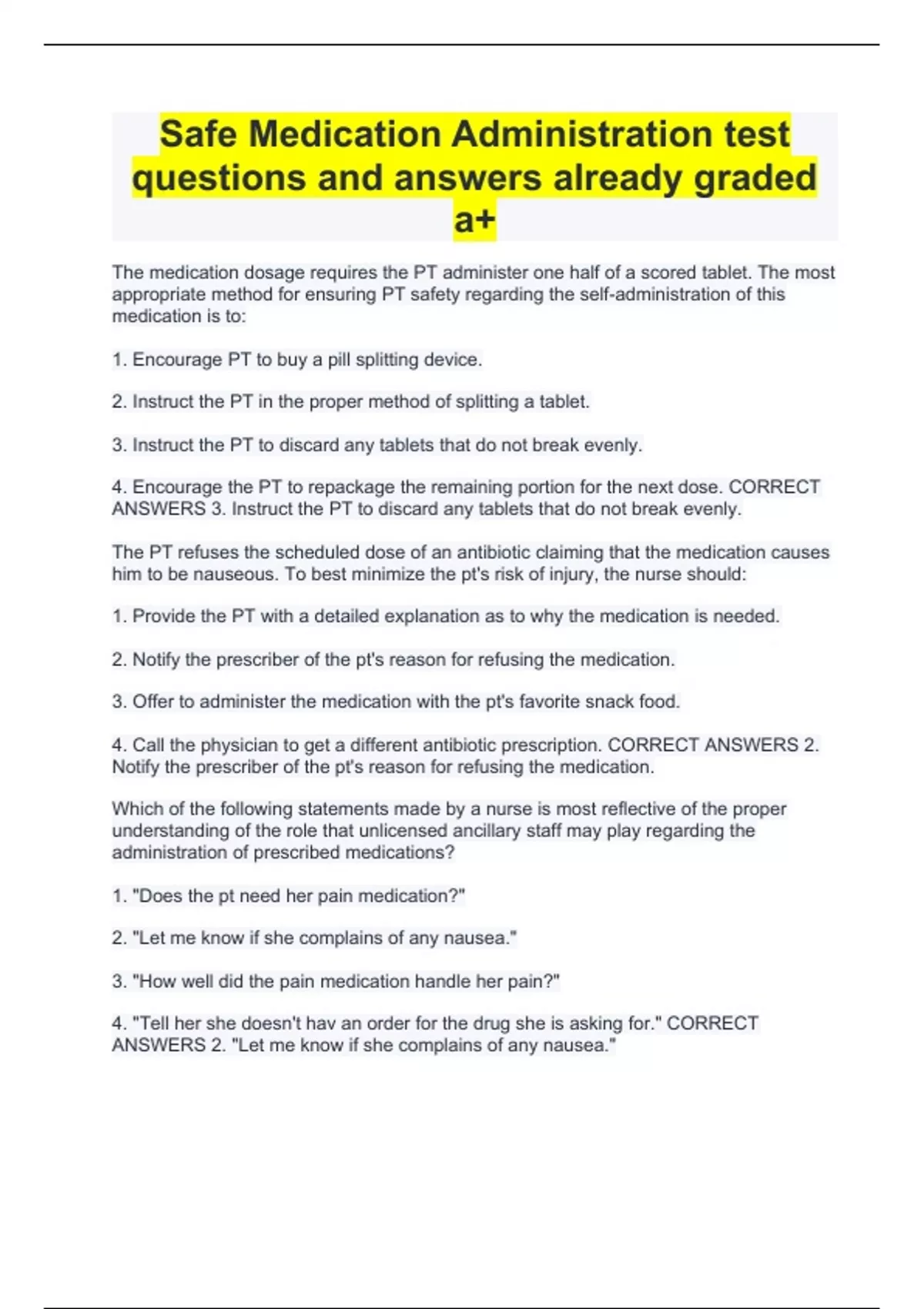 Safe Medication Administration test questions and answers already graded a+