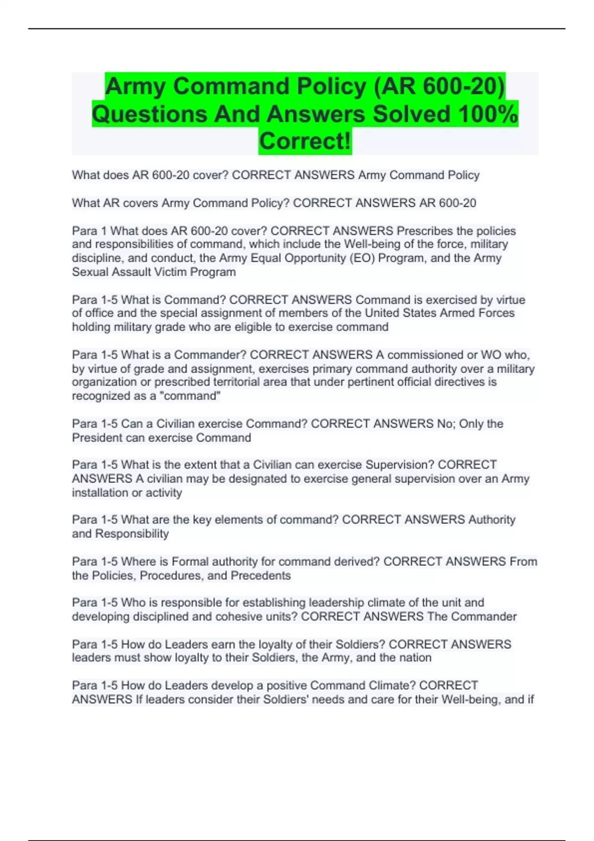 Army Command Policy (AR 600-20) Questions And Answers Solved 100% Correct!
