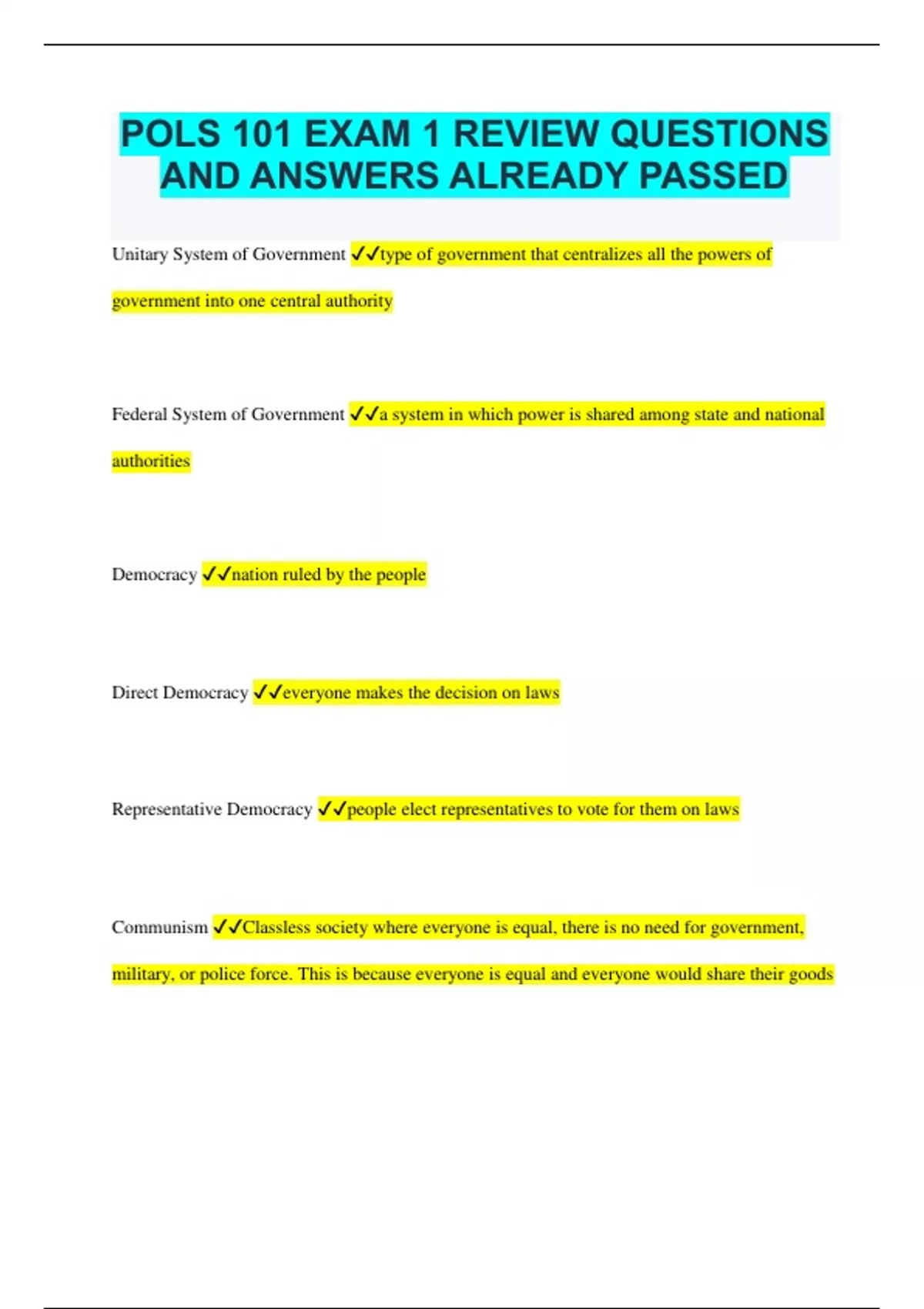 POLS 101 EXAM 1 REVIEW QUESTIONS AND ANSWERS ALREADY PASSED