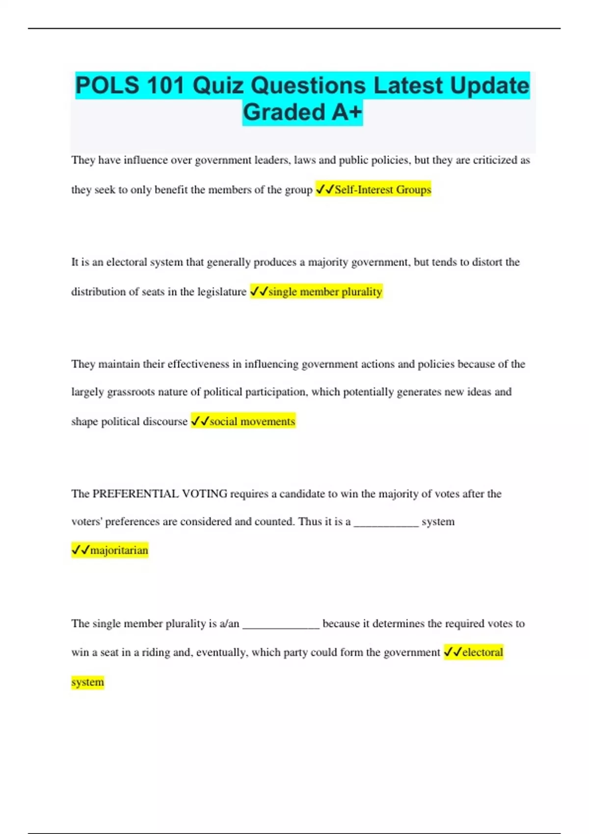 POLS 101 Quiz Questions Latest Update Graded A+ They have influence over government leaders, laws and public policies, but they are criticized as they seek to only benefit the members of the group Self-Interest Groups It is an electoral system that generally produces a majority government, but tends to distort the distribution of seats in the legislature single member plurality They maintain their effectiveness in influencing government actions and policies because of the largely grassroots nature of political participation, which potentially generates new ideas and shape political discourse social movements The PREFERENTIAL VOTING requires a candidate to win the majority of votes after the voters' preferences are considered and counted. Thus it is a ___________ system majoritarian The single member plurality is a/an _____________ because it determines the required votes to win a seat in a riding and, eventually, which party could form the government electoral system It is an electoral system that gives a political party seats based on winning a multi-member riding and after receiving certain required proportion of the votes Mixed-Member proportional Religious organizations are considered agents of ____________ that sometimes result to radicalism or moderation political socialization This perspective on the role of media in shaping political culture sees Fox News as largely conservative in its programming and Canada's CBC as liberal dominant ideology VOTING during election is an important democratic process because it is the primary means by which __________ participate in government affairs citizens Educating the public on important issues is crucial in free and fair democratic elections, thus, voters need ____________ political parties and candidates useful information from The citizens express publicly their thoughts and ideas on an issue such as their confidence and trust in government and politicians public opinion Family plays an important role in _______, thus, if our parents value voting and elections, we are more likely to vote during elections political socialization Political culture is significant because citizens do not only know the rules and functions of political and governance institutions, they also accept them indication _________ political legitimacy By allowing voters to choose among parties offering _______, elections let voters have influence in the overall direction they want the government to take different platforms It reflects the Canadians' political values, beliefs, and orientations wherein individual freedom is valued and cultural and ethic diversities are more accepted and tolerated than in the US political culture It is the ideology supporting New Public Management which adopts business practices into public administration neoliberalism One of the main tasks of democratic legislatures is to ______ debate, modify, and approve national budget When the interests of the voters in a riding, rather than the national interest are the priority representation is called delegate model ________ implies that congressional lawmakers can vote according to their constituencies' wishes weak party discipline