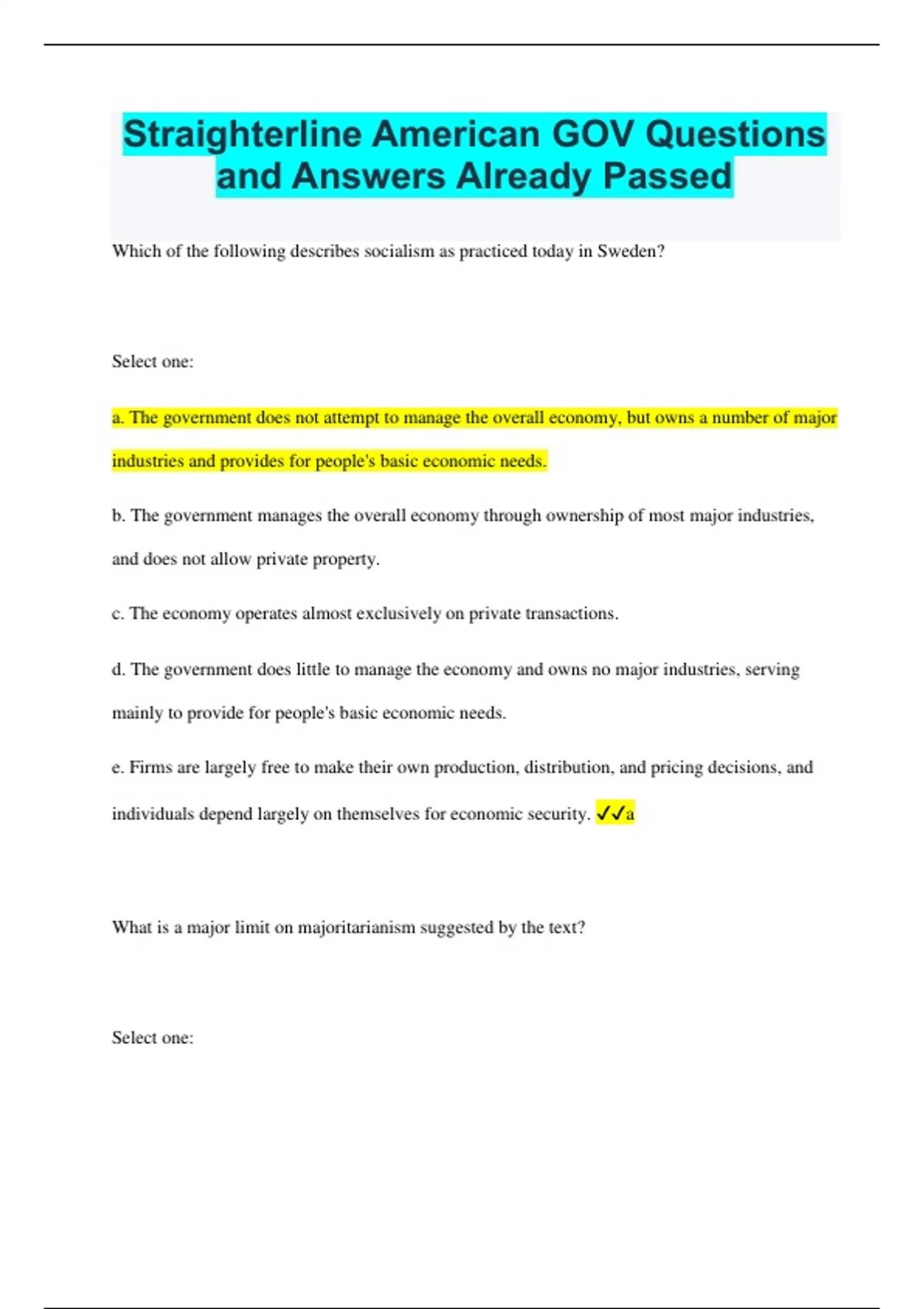 Straighterline American GOV Questions and Answers Already Passed Which of the following describes socialism as practiced today in Sweden? Select one: a. The government does not attempt to manage the overall economy, but owns a number of major industries and provides for people's basic economic needs. b. The government manages the overall economy through ownership of most major industries, and does not allow private property. c. The economy operates almost exclusively on private transactions. d. The government does little to manage the economy and owns no major industries, serving mainly to provide for people's basic economic needs. e. Firms are largely free to make their own production, distribution, and pricing decisions, and individuals depend largely on themselves for economic security. a What is a major limit on majoritarianism suggested by the text? Select one: a. The public as a whole takes an interest in only a few of the hundreds of policy decisions that U.S. officials make each year. b. The public lacks access to the information required to take informed political action on most issues dealt with by the government each year. c. The actions of special interest groups are ultimately more influential than the voting power of the public. d. The rapid turnover of government officials and members of the legislature prevents the majority public from making a sustained effort for any single issue. e. The most power tends to reside with a wealthy minority of the voting public, preventing the majority public from setting the issue agenda. a What type of government suppresses individuality, forcing people to think and act in prescribed ways or risk punishment? Select one: a. communistic b. socialistic c. authoritarian d. egalitarian e. republican c From 1945 until the late 1960s, there was the highest degree of bipartisanship in the area of: Select one: a. economic regulation. b. taxation levels. c. civil rights. d. foreign affairs. e. environmental policy. d What new policy was established by the U.S. Supreme Court's landmark Gideon v. Wainwright ruling? Select one: a. the right to trial by jury b. the need to charge an arrested suspect with a specific crime within 24 hours of arrest c. the requirement that police read a suspect his rights before or during arrest d. government provision of free legal counsel to the accused if they are too poor to hire a lawyer e. the practice of allowing a suspect out on bail until the time of the trial d Pluralism contends that, on most issues: Select one: a. corporate elites have more control over economic policy than do "the politicians in the visible government." b. the will of the majority of the voting public determines government policy. c. it is the preferences of special-interest groups that largely determine what government does. d. true authority lies with the elected politicians, and not with the public that put them in office. e. the diverse nature of the citizenry enhances the democratic process in policymaking. c One example of an authoritarian regime is: Select one: a. Great Britain. b. France. c. the United States. d. China. e. Canada. d Political knowledge has been shown to be important Select one: a. in order to determine your political party affiliation. b. so that you understand what is being reported in the media. c. because it fosters civic participation. d. so that people's political views can be distorted by politicians. e. so political leaders are better able to "spin" their message. c In a survey of college students, the Intercollegiate Studies Association found that the best predictor of a student's later participation in the nation's civic and political life is Select one: