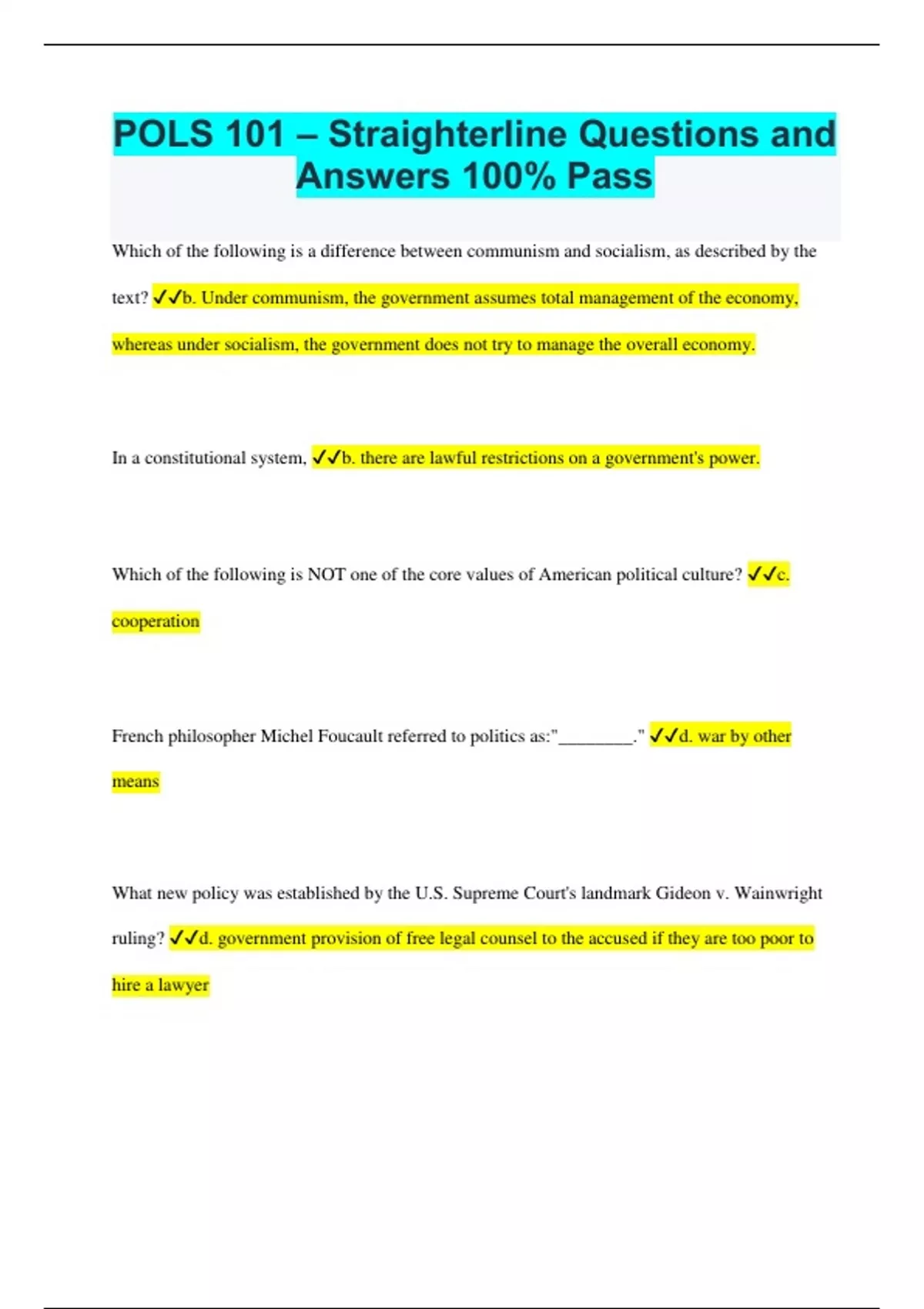 POLS 101 – Straighterline Questions and Answers 100% Pass Which of the following is a difference between communism and socialism, as described by the text? b. Under communism, the government assumes total management of the economy, whereas under socialism, the government does not try to manage the overall economy. In a constitutional system, b. there are lawful restrictions on a government's power. Which of the following is NOT one of the core values of American political culture? c. cooperation French philosopher Michel Foucault referred to politics as:"________." d. war by other means What new policy was established by the U.S. Supreme Court's landmark Gideon v. Wainwright ruling? d. government provision of free legal counsel to the accused if they are too poor to hire a lawyer Pluralism contends that, on most issues: c. it is the preferences of special-interest groups that largely determine what government does. In a democratic society, who or what is responsible for personal development? d. the individual As described in the text, "political thinking" c. involves the careful gathering and sifting of information in the process of forming a knowledgeable view about a political issue. West West Virginia, the state with the lowest percentage of college graduates in the United States, e. has a higher proportion of college graduates than most European countries. To the framers, the great danger of democratic government was the risk of a. tyranny of the majority. In practice, the most significant restraint imposed by Congress on the president is its: c. power to make the laws and appropriate money, for these determine the programs the executive can implement. The direct election of U.S. senators came about due to b. political pressure from the Progressives. A contemporary legislator who voted for a bill because of a belief in its benefit, even though his constituents back home overwhelmingly opposed the bill, would be performing the Edmund Burke role of: a. trustee. Where is the Bill of Rights found in the Constitution? c. the first ten amendments Marbury v. Madison is a landmark Supreme Court decision because it b. set the precedent for judicial review. Which of the following aspects of U.S. government might be used as part of an argument that the U.S. is less democratic than some other democracies? e. its staggered terms of office of members of the legislature In his criticism of the Constitution, the economist Charles Beard argued that: a. the Constitution's elaborate systems of power and representation were designed to protect the interests of the rich. In 1787, most countries in the world had a(n)