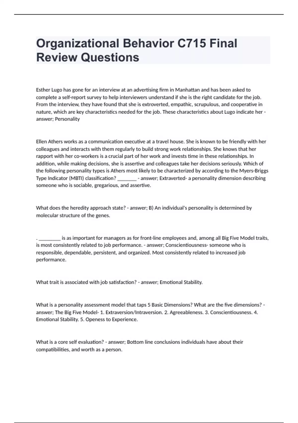 Organizational Behavior C715 Final Review Questions with correct answers
