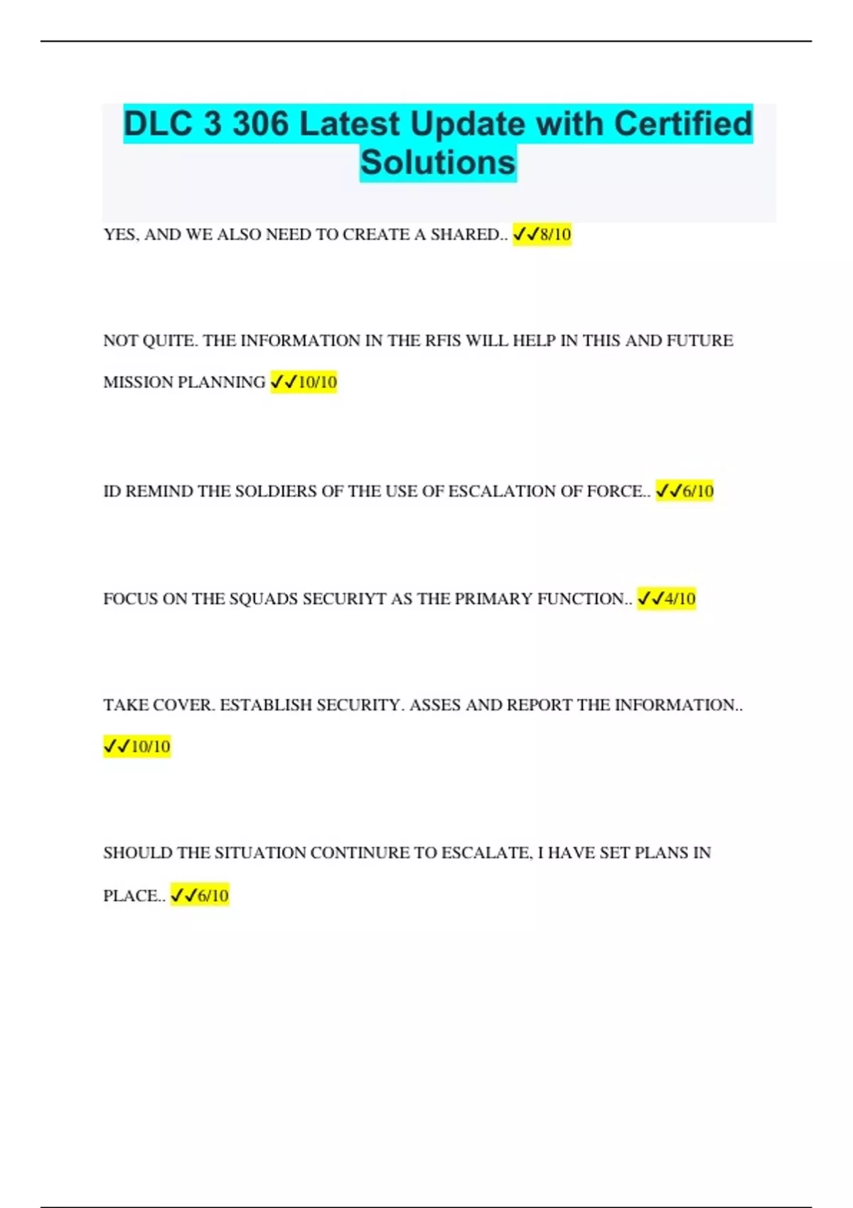 DLC 3 306 Latest Update with Certified Solutions YES, AND WE ALSO NEED TO CREATE A SHARED.. 8/10 NOT QUITE. THE INFORMATION IN THE RFIS WILL HELP IN THIS AND FUTURE MISSION PLANNING 10/10 ID REMIND THE SOLDIERS OF THE USE OF ESCALATION OF FORCE.. 6/10 FOCUS ON THE SQUADS SECURIYT AS THE PRIMARY FUNCTION.. 4/10 TAKE COVER. ESTABLISH SECURITY. ASSES AND REPORT THE INFORMATION.. 10/10 SHOULD THE SITUATION CONTINURE TO ESCALATE, I HAVE SET PLANS IN PLACE.. 6/10 REPORT THE TRUCK. REQUEST ADDITIONAL