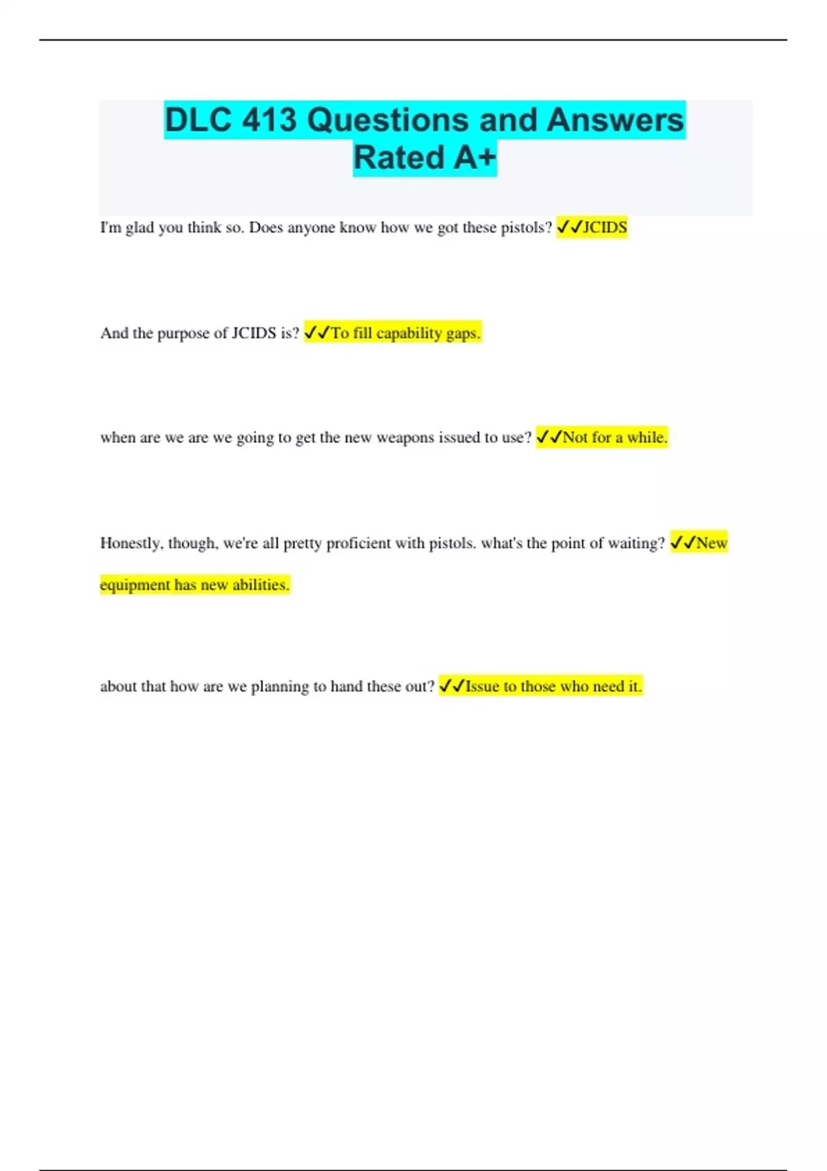 DLC 413 Questions and Answers Rated A+ I'm glad you think so. Does anyone know how we got these pistols? JCIDS And the purpose of JCIDS is? To fill capability gaps. when are we are we going to get the new weapons issued to use? Not for a while. Honestly, though, we're all pretty proficient with pistols. what's the point of waiting? New equipment has new abilities. about that how are we planning to hand these out? Issue to those who need it.
