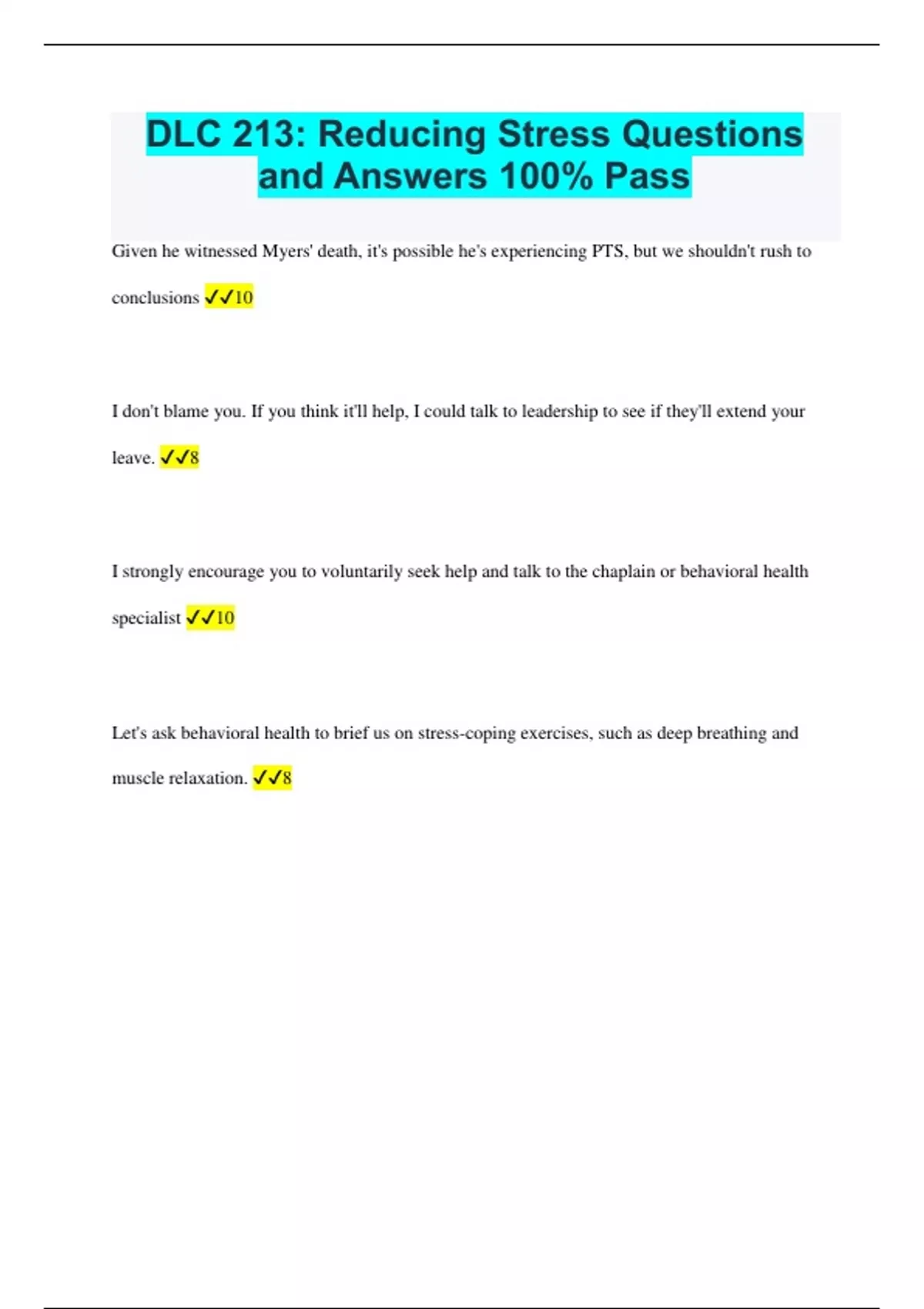 DLC 213: Reducing Stress Questions and Answers 100% Pass Given he witnessed Myers' death, it's possible he's experiencing PTS, but we shouldn't rush to conclusions 10 I don't blame you. If you think it'll help, I could talk to leadership to see if they'll extend your leave. 8 I strongly encourage you to voluntarily seek help and talk to the chaplain or behavioral health specialist 10 Let's ask behavioral health to brief us on stress-coping exercises, such as deep breathing and muscle relaxation. 8