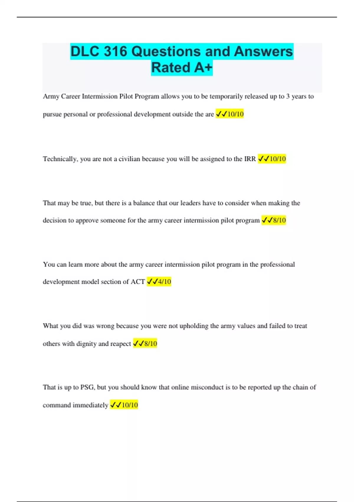 DLC 316 Questions and Answers Rated A+ Army Career Intermission Pilot Program allows you to be temporarily released up to 3 years to pursue personal or professional development outside the are 10/10 Technically, you are not a civilian because you will be assigned to the IRR 10/10 That may be true, but there is a balance that our leaders have to consider when making the decision to approve someone for the army career intermission pilot program 8/10 You can learn more about the army career intermission pilot program in the professional development model section of ACT 4/10 What you did was wrong because you were not upholding the army values and failed to treat others with dignity and reapect 8/10 That is up to PSG, but you should know that online misconduct is to be reported up the chain of command immediately 10/10 There are official policies, like ALARACT 058/2018 message, but those policies change. 8/10 Oh, I get it! You are no longer being considered for denial of continued service through QMP because the time in grade criteria changed from 36 months to 48 months 10/10 Perhaps you can relax for now, but you never know what policies could come up next. So make sure you are always at your best 8/10 Getting updates from your chain of command is good, but you need to be proactive in educating yourself on policies related to retaining quality NCOs 10/10 Career counselors, retention NCOs, s1 and the army