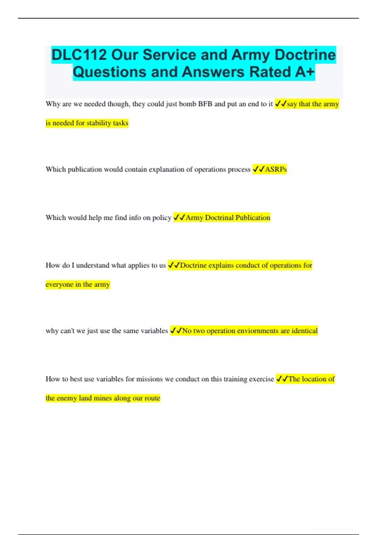 DLC112 Our Service and Army Doctrine Questions and Answers Rated A+ Why are we needed though, they could just bomb BFB and put an end to it say that the army is needed for stability tasks Which publication would contain explanation of operations process ASRPs Which would help me find info on policy Army Doctrinal Publication How do I understand what applies to us Doctrine explains conduct of operations for everyone in the army why can't we just use the same variables No two operation enviornments are identical How to best use variables for missions we conduct on this training exercise The location of the enemy land mines along our route Can you identify an operational variable NOT the number of japanese soldiers available for the mission What's our purpose We should aim to minimize damage caused to the civilian area -land units effectiveness depends on the units ability to manage civilian populations and areas I'm just a private... Knowing your job at
