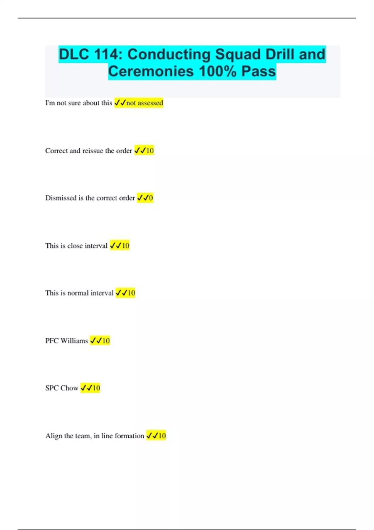 DLC 114: Conducting Squad Drill and Ceremonies 100% Pass I'm not sure about this not assessed Correct and reissue the order 10 Dismissed is the correct order 0 This is close interval 10 This is normal interval 10 PFC Williams 10 SPC Chow 10 Align the team, in line formation 10 It's a way to align the team in a column formation 10 Dress right, dress 10 Move to the right of the team, and inspect 10 At ease! 10 Right, face; cover 10 Forward, march 10 Column right, march 10 Right flank, march 10 Align the team from the right flank 10