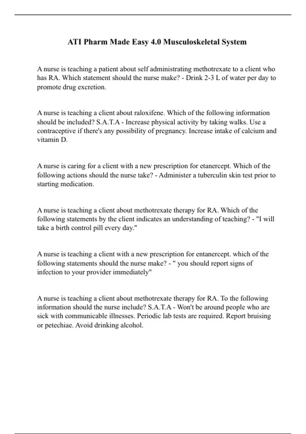 A nurse is teaching a patient about self administrating methotrexate to a client who has RA. Which statement should the nurse make? - Drink 2-3 L of water per day to promote drug excretion. A nurse is teaching a client about raloxifene. Which of the following information should be included? S.A.T.A - Increase physical activity by taking walks. Use a contraceptive if there's any possibility of pregnancy. Increase intake of calcium and vitamin D. A nurse is caring for a client with a new prescription for etanercept. Which of the following actions should the nurse take? - Administer a tuberculin skin test prior to starting medication. A nurse is teaching a client about methotrexate therapy for RA. Which of the following statements by the client indicates an understanding of teaching? - "I will take a birth control pill every day." A nurse is teaching a client with a new prescription for entanercept. which of the following statements should the nurse make? - " you should report signs of infection to your provider immediately" A nurse is teaching a client about methotrexate therapy for RA. To the following information should the nurse include? S.A.T.A - Won't be around people who are sick with communicable illnesses. Periodic lab tests are required. Report bruising or petechiae. Avoid drinking alcohol.A nurse is teaching a client about raloxifene therapy To prevent osteoporosis. The nurse should instruct the client to monitor for which of the adverse reactions? - Calf pain