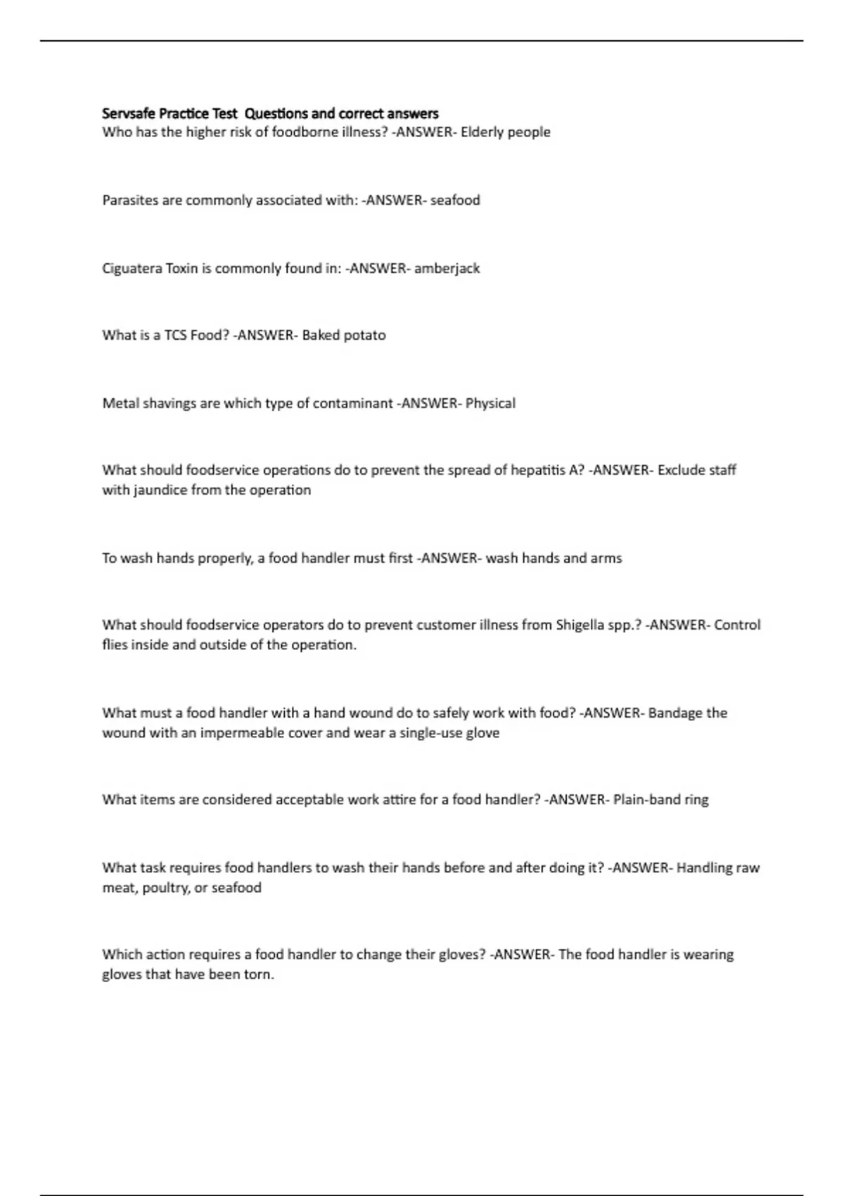 Who has the higher risk of foodborne illness? -ANSWER- Elderly people Parasites are commonly associated with: -ANSWER- seafood Ciguatera Toxin is commonly found in: -ANSWER- amberjack What is a TCS Food? -ANSWER- Baked potato Metal shavings are which type of contaminant -ANSWER- Physical What should foodservice operations do to prevent the spread of hepatitis A? -ANSWER- Exclude staff with jaundice from the operation To wash hands properly, a food handler must first -ANSWER- wash hands and arms What should foodservice operators do to prevent customer illness from Shigella spp.? -ANSWER- Control flies inside and outside of the operation. What must a food handler with a hand wound do to safely work with food? -ANSWER- Bandage the wound with an impermeable cover and wear a single-use glove What items are considered acceptable work attire for a food handler? -ANSWER- Plain-band ring What task requires food handlers to wash their hands before and after doing it? -ANSWER- Handling raw meat, poultry, or seafood Which action requires a food handler to change their gloves? -ANSWER- The food handler is wearing gloves that have been torn. How should the temperature of a shipment of cottage cheese be taken when it arrives in the operation? -ANSWER- Place the thermometer stem into an opened container When should a shipment of fresh chicken be rejected? -ANSWER- The receiving temperature is 50F Where should ground fish be stored in a cooler? -ANSWER- below the pork roasts What is the maximum number of days that ready-to-eat food can be stored if held at 41F? -ANSWER- 7 days In top-to-bottom order, how should a fresh beef roast, fresh halibut, lettuce, and a pan of ground chicken be stored? -ANSWER- Lettuce, fresh halibut, fresh beef roast, ground chicken What organization requires Material Safety Data Sheets? -ANSWER- OSHA