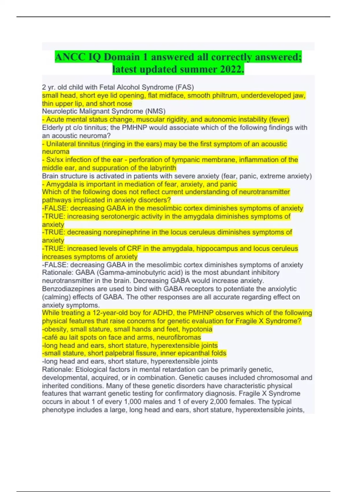 ANCC IQ Domain 1 answered all correctly answered; latest updated summer 2022. 2 yr. old child with Fetal Alcohol Syndrome (FAS) small head, short eye lid opening, flat midface, smooth philtrum, underdeveloped jaw, thin upper lip, and short nose Neuroleptic Malignant Syndrome (NMS) - Acute mental status change, muscular rigidity, and autonomic instability (fever) Elderly pt c/o tinnitus; the PMHNP would associate which of the following findings with an acoustic neuroma? - Unilateral tinnitus (ringing in the ears) may be the first symptom of an acoustic neuroma - Sx/sx infection of the ear - perforation of tympanic membrane, inflammation of the middle ear, and suppuration of the labyrinth Brain structure is activated in patients with severe anxiety (fear, panic, extreme anxiety) - Amygdala is important in mediation of fear, anxiety, and panic Which of the following does not reflect current understanding of neurotransmitter pathways implicated in anxiety disorders? -FALSE: decreasing GABA in the mesolimbic cortex diminishes symptoms of anxiety -TRUE: increasing serotonergic activity in the amygdala diminishes symptoms of anxiety -TRUE: decreasing norepinephrine in the locus ceruleus diminishes symptoms of anxiety -TRUE: increased levels of CRF in the amygdala, hippocampus and locus ceruleus increases symptoms of anxiety -FALSE: decreasing GABA in the mesolimbic cortex diminishes symptoms of anxiety Rationale: GABA (Gamma-aminobutyric acid) is the most abundant inhibitory neurotransmitter in the brain. Decreasing GABA would increase anxiety. Benzodiazepines are used to bind with GABA receptors to potentiate the anxiolytic (calming) effects of GABA. The other responses are all accurate regarding effect on anxiety symptoms. While treating a 12-year-old boy for ADHD, the PMHNP observes which of the following physical features that raise concerns for genetic evaluation for Fragile X Syndrome? -obesity, small stature, small hands and feet, hypotonia -café au lait spots on face and arms, neurofibromas -long head and ears, short stature, hyperextensible joints -small stature, short palpebral fissure, inner epicanthal folds -long head and ears, short stature, hyperextensible joints Rationale: Etiological factors in mental retardation can be primarily genetic, developmental, acquired, or in combination. Genetic causes included chromosomal and inherited conditions. Many of these genetic disorders have characteristic physical features that warrant genetic testing for confirmatory diagnosis. Fragile X Syndrome occurs in about 1 of every 1,000 males and 1 of every 2,000 females. The typical phenotype includes a large, long head and ears, short stature, hyperextensible joints,