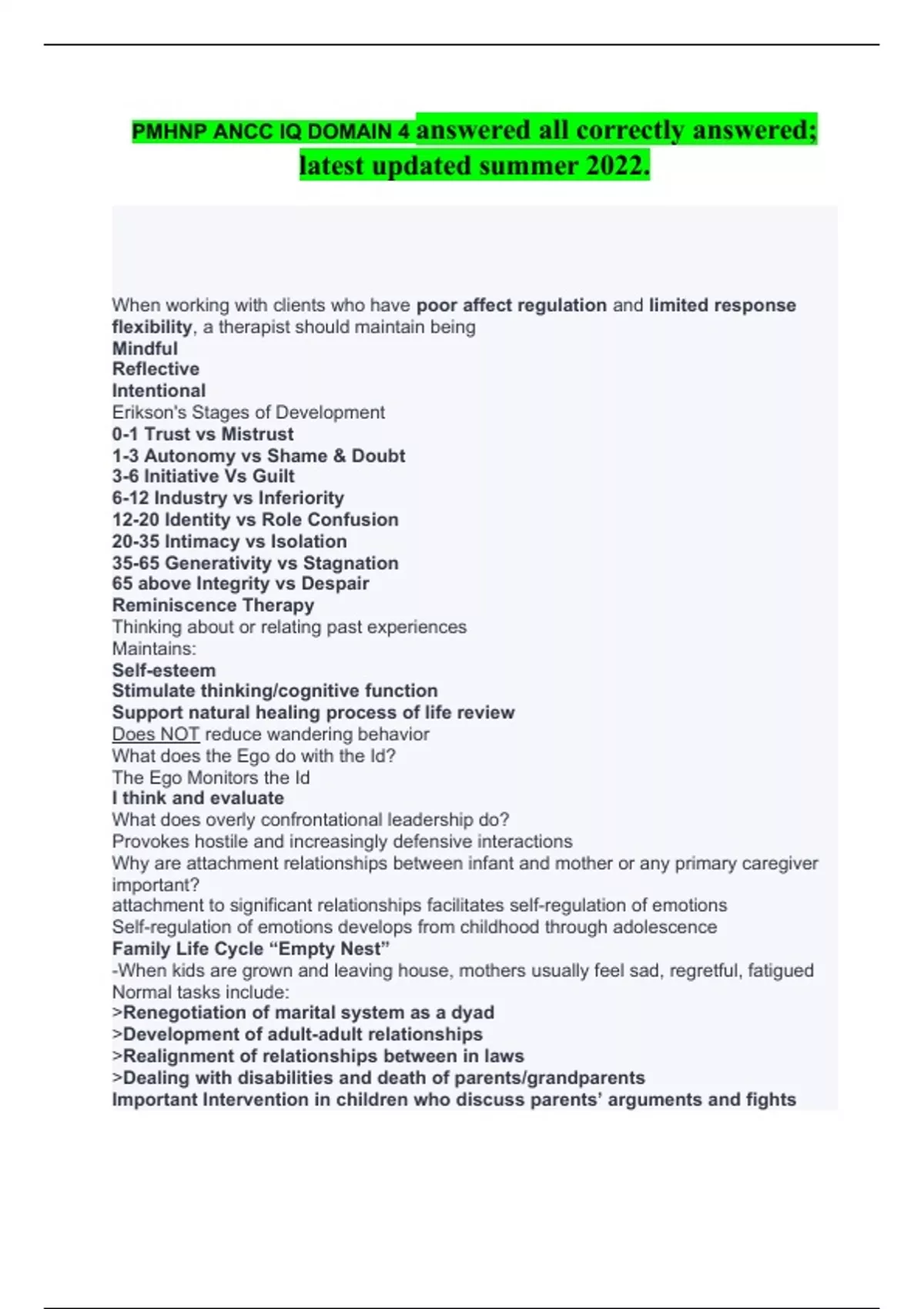 PMHNP ANCC IQ DOMAIN 4 answered all correctly answered; latest updated summer 2022. When working with clients who have poor affect regulation and limited response flexibility, a therapist should maintain being Mindful Reflective Intentional Erikson's Stages of Development 0-1 Trust vs Mistrust 1-3 Autonomy vs Shame & Doubt 3-6 Initiative Vs Guilt 6-12 Industry vs Inferiority 12-20 Identity vs Role Confusion 20-35 Intimacy vs Isolation 35-65 Generativity vs Stagnation 65 above Integrity vs Despair Reminiscence Therapy Thinking about or relating past experiences Maintains: Self-esteem Stimulate thinking/cognitive function Support natural healing process of life review Does NOT reduce wandering behavior What does the Ego do with the Id? The Ego Monitors the Id I think and evaluate What does overly confrontational leadership do? Provokes hostile and increasingly defensive interactions Why are attachment relationships between infant and mother or any primary caregiver important? attachment to significant relationships facilitates self-regulation of emotions Self-regulation of emotions develops from childhood through adolescence Family Life Cycle “Empty Nest” -When kids are grown and leaving house, mothers usually feel sad, regretful, fatigued Normal tasks include: >Renegotiation of marital system as a dyad >Development of adult-adult relationships >Realignment of relationships between in laws >Dealing with disabilities and death of parents/grandparents Important Intervention in children who discuss parents’ arguments and fights