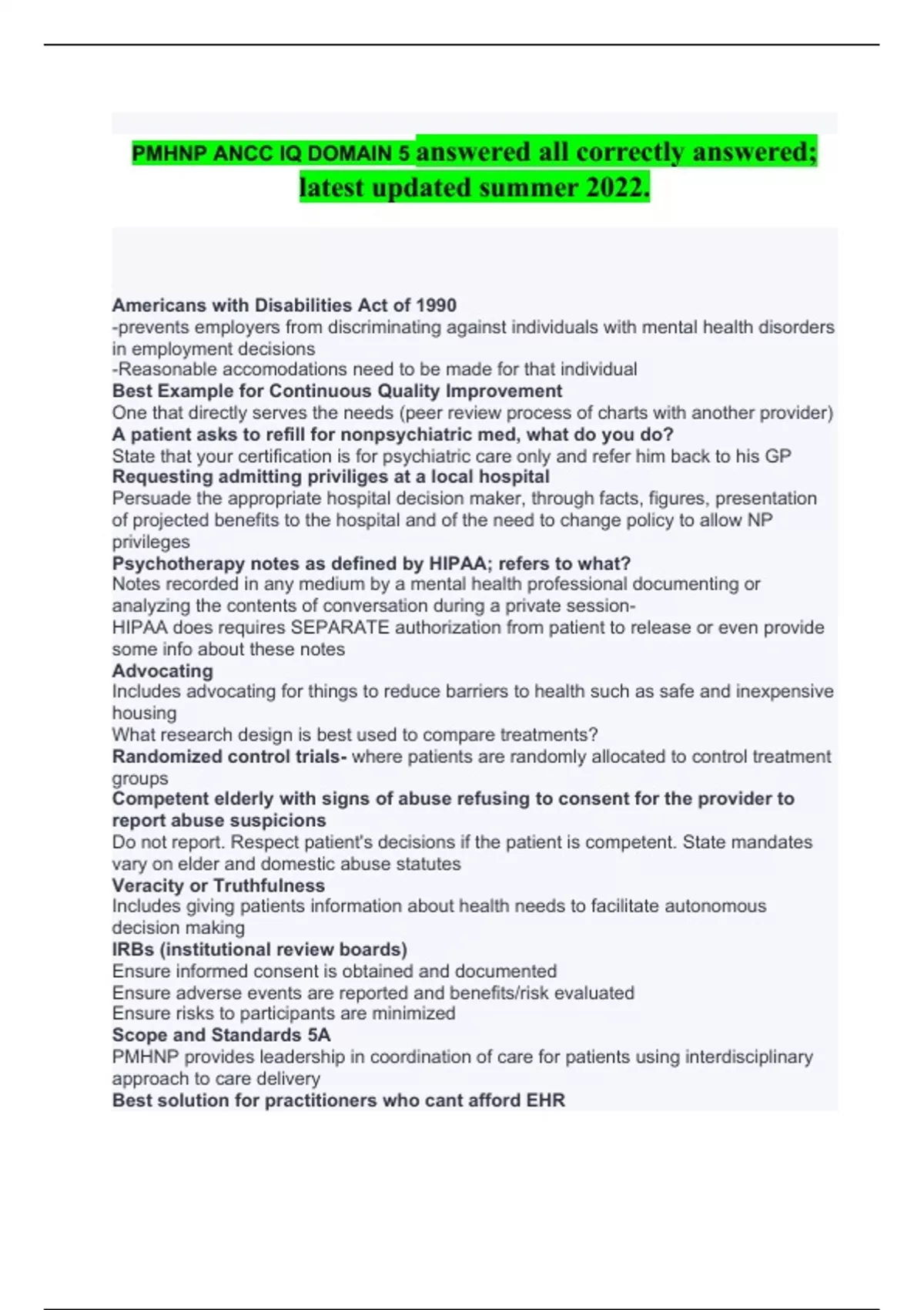 PMHNP ANCC IQ DOMAIN 5 answered all correctly answered; latest updated summer 2022. Americans with Disabilities Act of 1990 -prevents employers from discriminating against individuals with mental health disorders in employment decisions -Reasonable accomodations need to be made for that individual Best Example for Continuous Quality Improvement One that directly serves the needs (peer review process of charts with another provider) A patient asks to refill for nonpsychiatric med, what do you do? State that your certification is for psychiatric care only and refer him back to his GP Requesting admitting priviliges at a local hospital Persuade the appropriate hospital decision maker, through facts, figures, presentation of projected benefits to the hospital and of the need to change policy to allow NP privileges Psychotherapy notes as defined by HIPAA; refers to what? Notes recorded in any medium by a mental health professional documenting or analyzing the contents of conversation during a private session- HIPAA does requires SEPARATE authorization from patient to release or even provide some info about these notes Advocating Includes advocating for things to reduce barriers to health such as safe and inexpensive housing What research design is best used to compare treatments? Randomized control trials- where patients are randomly allocated to control treatment groups Competent elderly with signs of abuse refusing to consent for the provider to report abuse suspicions Do not report. Respect patient's decisions if the patient is competent. State mandates vary on elder and domestic abuse statutes Veracity or Truthfulness Includes giving patients information about health needs to facilitate autonomous decision making IRBs (institutional review boards) Ensure informed consent is obtained and documented Ensure adverse events are reported and benefits/risk evaluated Ensure risks to participants are minimized Scope and Standards 5A PMHNP provides leadership in coordination of care for patients using interdisciplinary approach to care delivery Best solution for practitioners who cant afford EHR Process notes and patient records in secure electronic system with a template for patient information and interactions, supporting quick access within your network Rural hospitals receive financial help for EHRs Incentives are provided for having EHRs Incident Reports Part of organizational reporting mechanism for RISK MANAGEMENT, not included in medical record What is included in the medical record? Format: 1. Reason for encounter and relevant hx 2. Physical exam findings and prior dx tests 3. Assessment, clinical impression or dx 4. Plan of care 5. Legible identity of provider Additionally if not already documented: Reason for diagnostic and ancillary services ordered Past and present dx should be accessible to treating and/or consulting provider Health risks identified Response to tx and changes in tx Revision of dx What should the progress note reflect? The type of services and dx codes reflected on the billing statement CPT codes for service provided ICD 10 and or DSM V Codes Social Justice Bringing care or access to those who have the least means of getting care but need the care the most HIPAA 1996 Federal law intended to protect employed Americans by decreasing the chance of losing existing health insurance coverage, facilitating purchase of individual or family health insurance coverage if coverage is lost from an employer's plan or no other health insurance is available Preceptor’s Responsibility Gaining permission from the patient for the student to perform evaluation and to ensure quality of evaluation; preceptor uses judgment if task is appropriate based on student's capability Phone Interactions with Patients Must be documented fully at all times LACE Consensus Model for APRNS 2015 PMHNP FAMILY POPULATION AARP 2009 Pamphlet Identified nurses as "paraprofessionals" trained to assist professionals Preceptor Role Contracted defined role with goals. Teaching is completed through