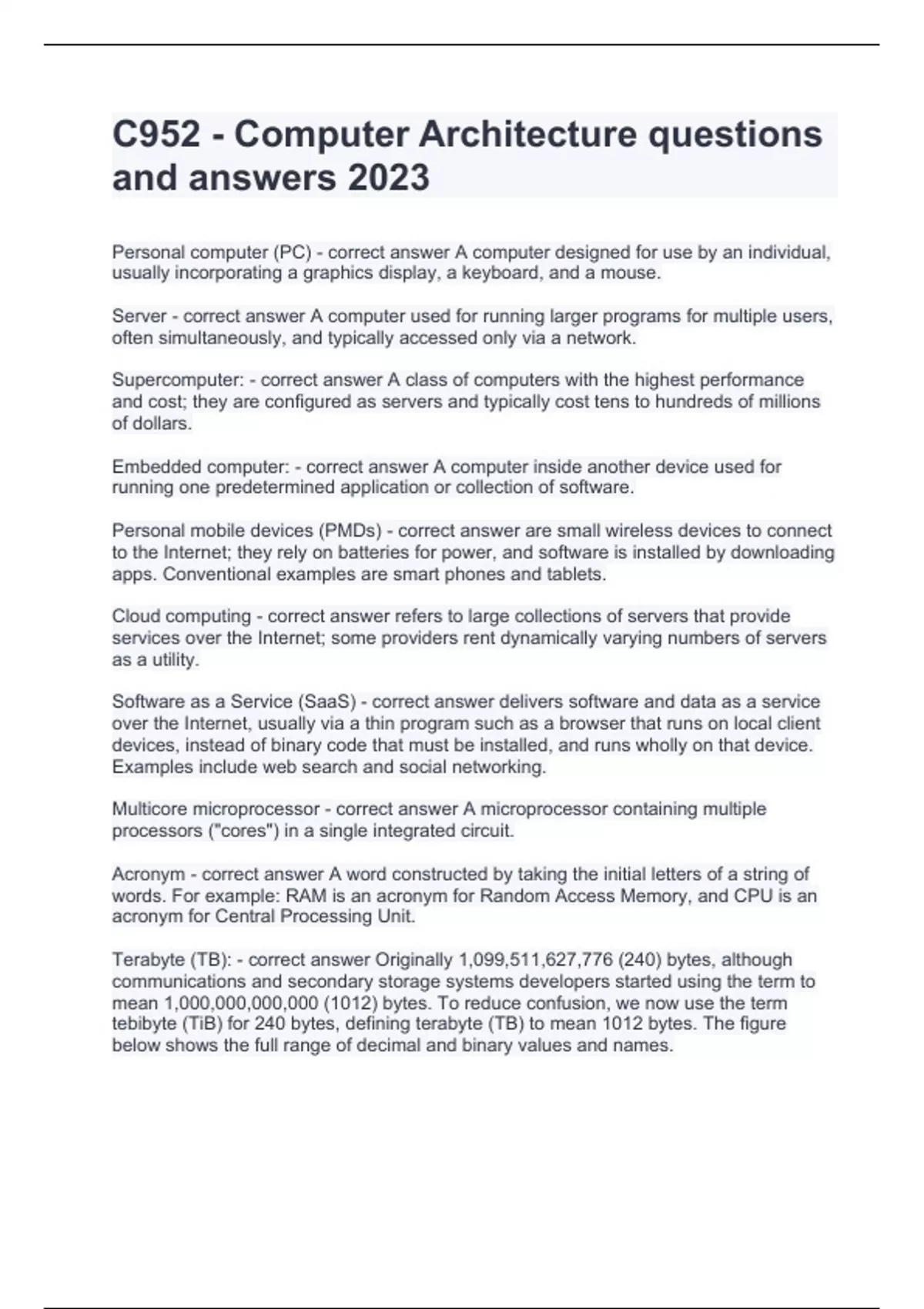 C952 - Computer Architecture questions and answers 2024