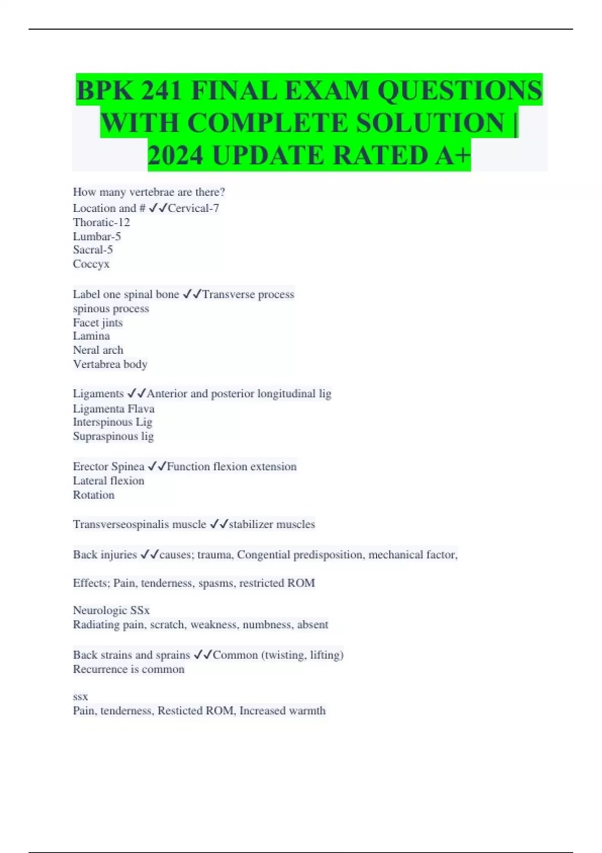 BPK 241 FINAL EXAM QUESTIONS WITH COMPLETE SOLUTION | 2024 UPDATE RATED A+ How many vertebrae are there? Location and # Cervical-7 Thoratic-12 Lumbar-5 Sacral-5 Coccyx Label one spinal bone Transverse process spinous process Facet jints Lamina Neral arch Vertabrea body Ligaments Anterior and posterior longitudinal lig Ligamenta Flava Interspinous Lig Supraspinous lig Erector Spinea Function flexion extension Lateral flexion Rotation Transverseospinalis muscle stabilizer muscles Back injuries causes; trauma, Congential predisposition, mechanical factor, Effects; Pain, tenderness, spasms, restricted ROM Neurologic SSx Radiating pain, scratch, weakness, numbness, absent Back strains and sprains Common (twisting, lifting) Recurrence is common ssx Pain, tenderness, Resticted ROM, Increased warmth