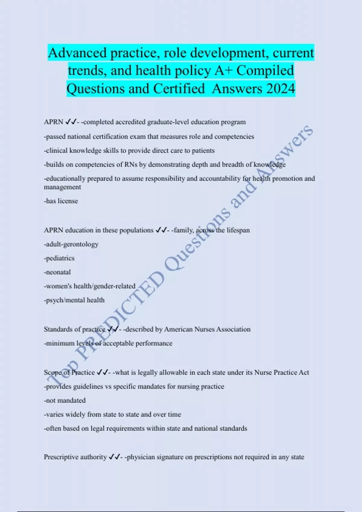Advanced practice, role development, current trends, and health policy A+ Compiled Questions and Certified Answers 2024