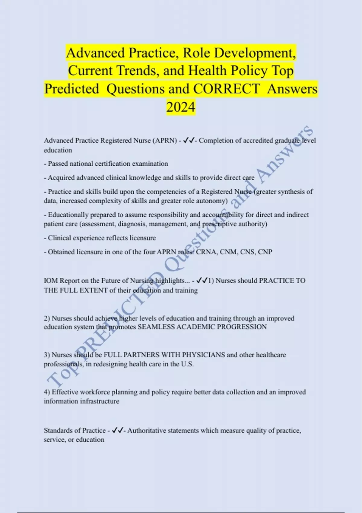 Advanced Practice, Role Development, Current Trends, and Health Policy Top Predicted Questions and CORRECT Answers 2024 Advanced Practice Regist ered Nurse (APRN) - ✔✔- Completion of accredited graduate level education - Passed national certification examination - Acquired advanced clinical knowledge and skills to provide direct care - Practice and skills build upon the competencies of a Registered Nurse (greater synthesis of data, increased complexity of skills and greater role autonomy) - Educationally prepared to assume responsibility and accountability for direct and indirect patient care (assessment, diagnosis, management, and prescriptive auth ority) - Clinical experience reflects licensure - Obtained licensure in one of the four APRN roles: CRNA, CNM, CNS, CNP IOM Report on the Future of Nursing highlights... - ✔✔1) Nurses should PRACTICE TO THE FULL EXTENT of their education and training 2) Nurses should achieve higher levels of education and training through an improved education system that promotes SEAMLESS ACADEMIC PROGRESSION 3) Nurses should be FULL PARTNERS WITH PHYSICIANS and other healthcare professionals, in redesigning health c are in the U.S. 4) Effective workforce planning and policy require better data collection and an improved information infrastructure Standards of Practice - ✔✔- Authoritative statements which measure quality of practice, service, or education - Establis hes minimum levels of acceptable performance - Provides a means to measure quality of care received - Can be used to provide legal expectations of practice, but were not designed to define standards of practice for clinical or legal purposes Scope of Pr actice - ✔✔- Based on what is legally allowable in each state under its Nurse Practice Act - Provides guidelines vs. specific mandates for nursing practice - Is NOT mandated - Varies widely from state to state Prescriptive Authority - ✔✔NPs have author ity to write pharmacological prescriptions, and also for medical devices - independent of a physician's signature Nursing Practice Acts - ✔✔- Establish statutory authority for licensure of a Registered Nurse - Includes use of title, authorization for scop e of practice, and disciplinary grounds Clinical Practice Guidelines/Protocols - ✔✔Systematically developed statements to assist practitioner and patient about appropriate care for specific clinical outcomes The Consensus Model for Future Regulation of APRN practice describes four essential components - ✔✔LACE: 1) Licensure 2) Accreditation 3) Certification 4) Education
