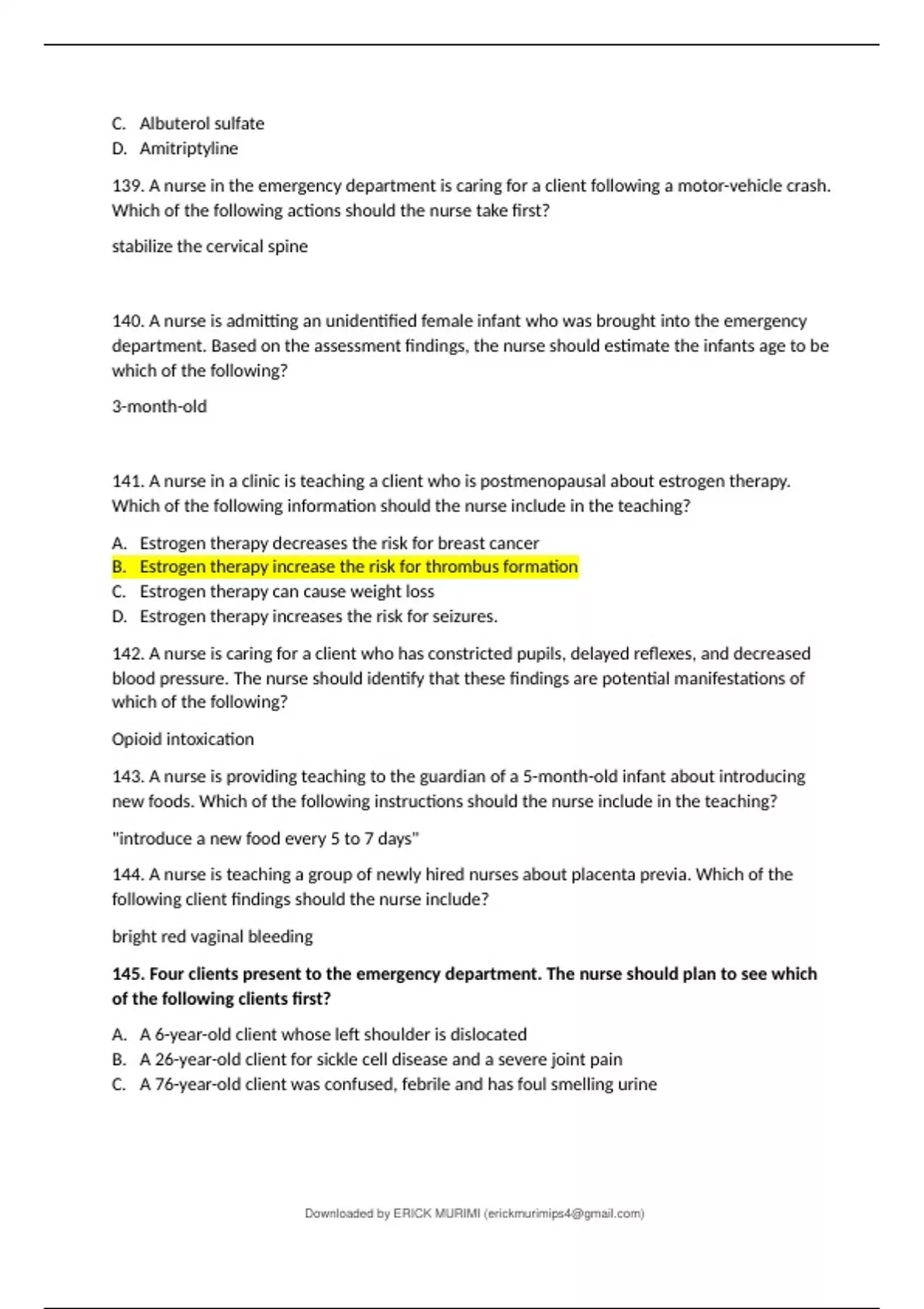 dministers the injection against the clients wishes. The nurse committed which of the following? A. Battery B. Assault C. Coercion D. A break of duty 124. A nurse is caring for a client who has opioid use disorder and is experiencing withdrawal. Which of the following findings should the nurse expect? A. Hyperflexia B. Meiosis C. Euphoria D. Hypothermia 125. A community health nurse is performing a vision screening on a 4-month-old infant. When shining a light source into the infant’s visual field. which of the following is an expected finding? A. The infant’s eyes turn toward the light B. The infant’s head turns away from the light C. The infant’s eyes remain focused toward the floor D. The infant closes their eyes E. 126. A nurse is assessing a client who has pneumococcal pneumonia. Which of the following findings should the nurse expect? Tachypnea 127. A nurse is teaching the parent of a school-age child who has scabies about the application of permethrin 5% cream. the Nurse should include which of the following as a potential adverse effect of the medication? A. Burning B. Discoloration C. Photosensitivity D. Alopecia 128. A nurse is collecting a specimen for an aerobic culture from a client who has a draining pressure injury. Identify the sequence of actions the nurse should take? AEBCD. a. Assess the appearance of the wound