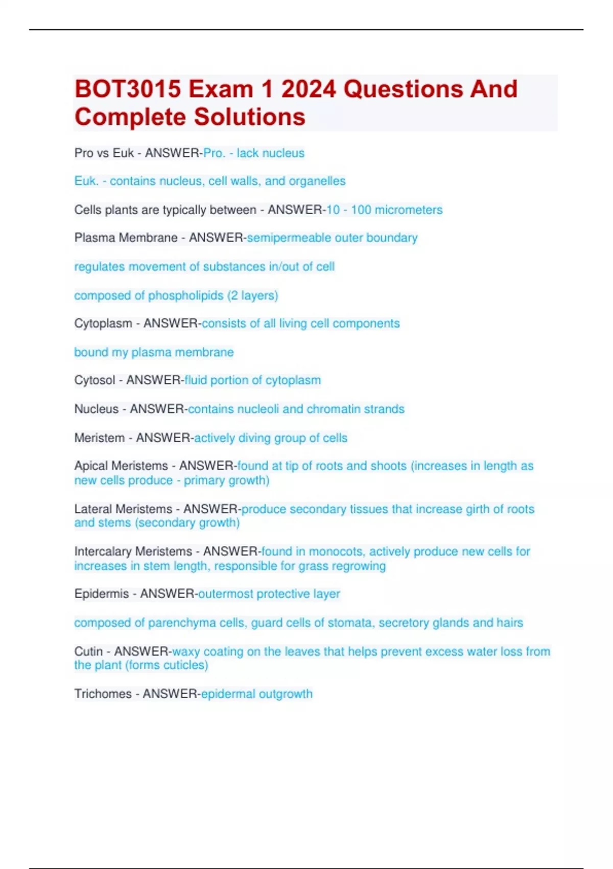 BOT3015 Exam 1 2024 Questions And Complete Solutions