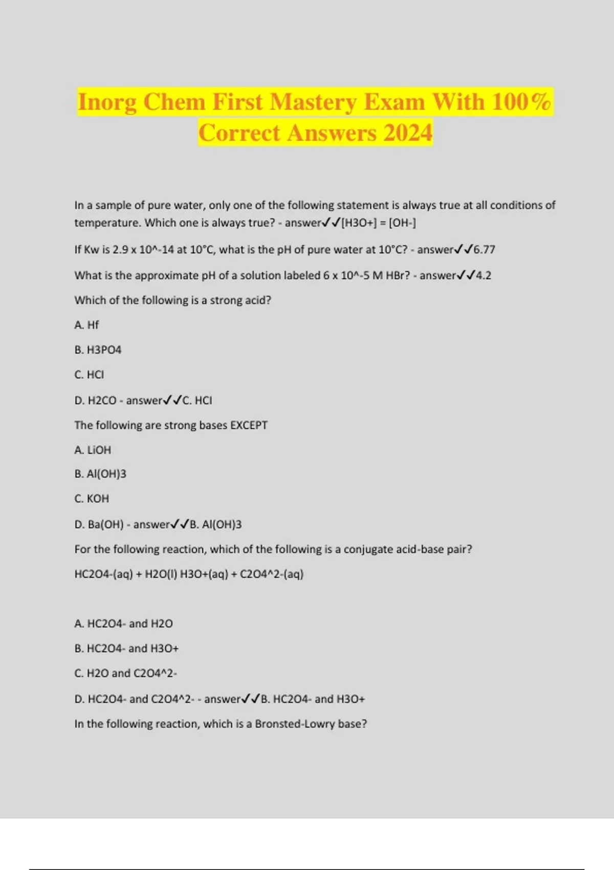 Inorg Chem First Mastery Exam With 100% Correct Answers 2024 In a sample of pure water, only one of the following statement is always true at all conditions of temperature. Which one is always true? - answer[H3O+] = [OH-] If Kw is 2.9 x 10^-14 at 10°C, what is the pH of pure water at 10°C? - answer6.77 What is the approximate pH of a solution labeled 6 x 10^-5 M HBr? - answer4.2 Which of the following is a strong acid? A. Hf B. H3PO4 C. HCI D. H2CO - answerC. HCI The following are strong bases EXCEPT A. LiOH B. Al(OH)3 C. KOH D. Ba(OH) - answerB. Al(OH)3 For the following reaction, which of the following is a conjugate acid-base pair? HC2O4-(aq) + H2O(l) H3O+(aq) + C2O4^2-(aq) A. HC2O4- and H2O B. HC2O4- and H3O+ C. H2O and C2O4^2- D. HC2O4- and C2O4^2- - answerB. HC2O4- and H3O+ In the following reaction, which is a Bronsted-Lowry base? HC2O4-(aq) + H2O(l) H3O+(aq) + C2O4^2-(aq) A. HC2O4- B. H2O C. H3O+ D. None of these - answerD. None of these A Bronsted Lowry base is defined as a substance that __________________________. - answeracts as a proton acceptor For the following reaction, which of