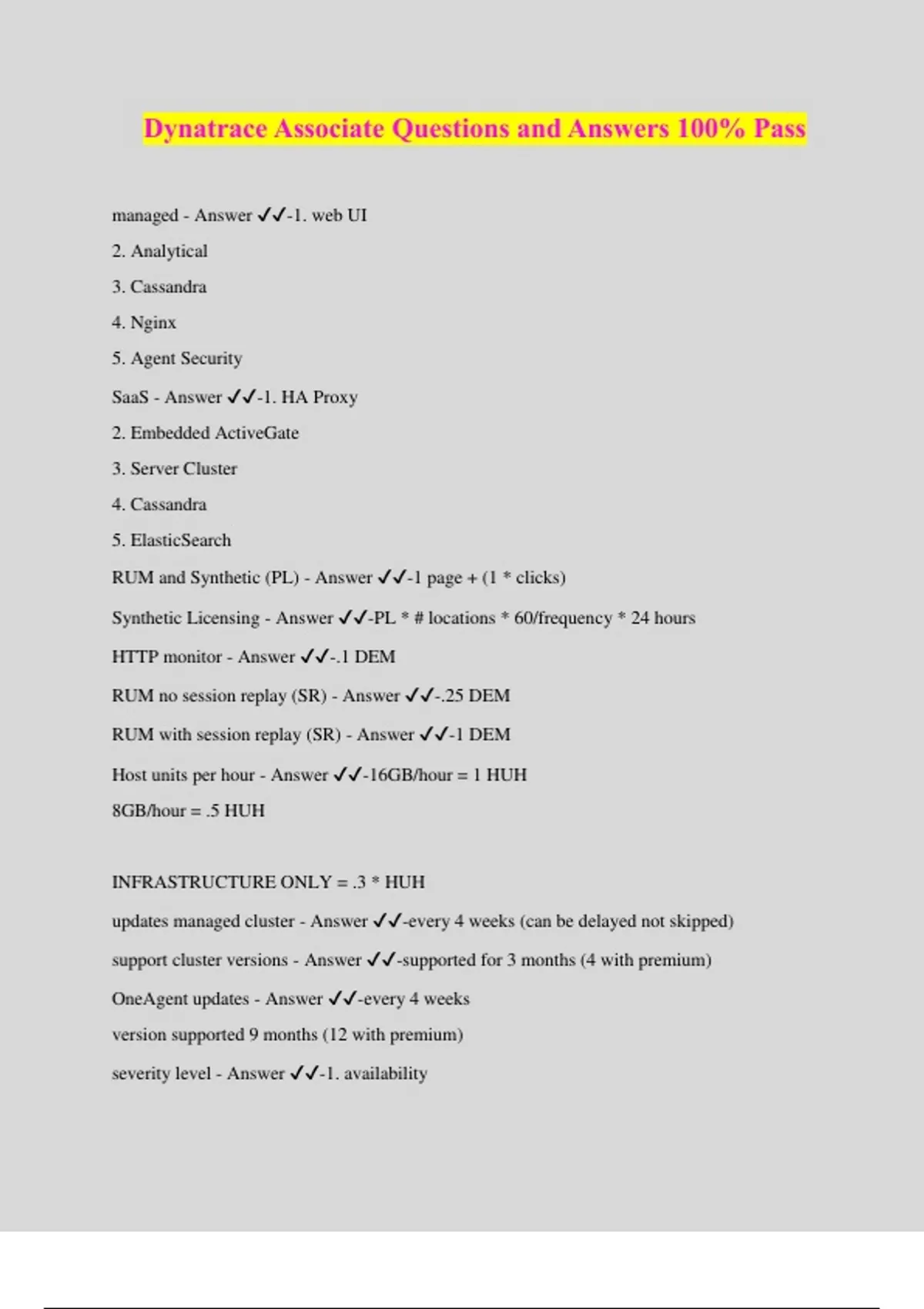 Dynatrace Associate Questions and Answers 100% Pass managed - Answer ️️ -1. web UI 2. Analytical 3. Cassandra 4. Nginx 5. Agent Security SaaS - Answer ️️ -1. HA Proxy 2. Embedded ActiveGate 3. Server Cluster 4. Cassandra 5. ElasticSearch RUM and Synthetic (PL) - Answer ️️ -1 page + (1 * clicks) Synthetic Licensing - Answer ️️ -PL * # locations * 60/frequency * 24 hours HTTP monitor - Answer ️️ -.1 DEM RUM no session replay (SR) - Answer ️️ -.25 DEM RUM with session replay (SR) - Answer ️️ -1 DEM Host units per hour - Answer ️️ -16GB/hour = 1 HUH 8GB/hour = .5 HUH INFRASTRUCTURE ONLY = .3 * HUH updates managed cluster - Answer ️️ -every 4 weeks (can be delayed not skipped) support cluster versions - Answer ️️ -supported for 3 months (4 with premium) OneAgent updates - Answer ️️ -every 4 weeks version supported 9 months (12 with premium) severity level - Answer ️️ -1. availability