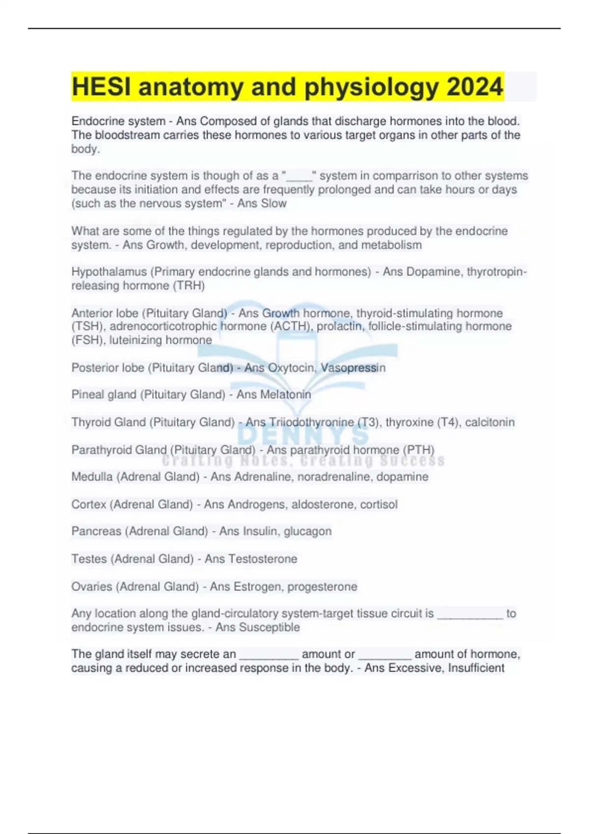HESI anatomy and physiology 2024 Comprehensive Questions and Answers 100% Accuracy Endocrine system, The endocrine system is though of as a "____" system in comparrison to other systems because its initiation and effects are frequently prolonged and can take hours or days (such as the nervous system" What are some of the things regulated by the hormones produced by the endocrine system., Hypothalamus (Primary endocrine glands and hormones), Anterior lobe (Pituitary Gland), Posterior lobe (Pituitary Gland), Pineal gland (Pituitary Gland), Thyroid Gland (Pituitary Gland), Testes (Adrenal Gland) Testosterone Ovaries (Adrenal Gland) Estrogen, progesterone Any location along the gland-circulatory system-target tissue circuit is __________ to endocrine system issues. Susceptible The gland itself may secrete an _________ amount or ________ amount of hormone, causing a reduced or increased response in the body. Excessive, Insufficient T or F? Circulatory problems may result in delayed or weaker response if hormones are not delivered to the target organ as intended. True