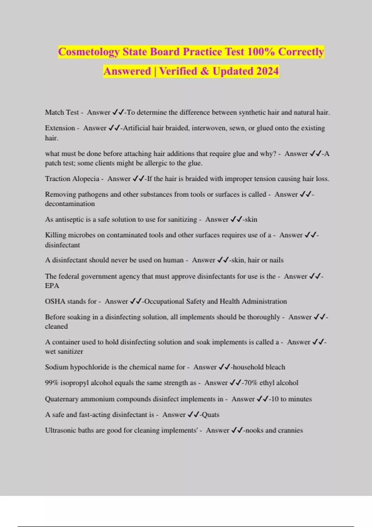 Cosmetology State Board Practice Test 100% Correctly Answered | Verified & Updated 2024 Match Test - Answer ️️ -To determine the difference between synthetic hair and natural hair. Extension - Answer ️️ -Artificial hair braided, interwoven, sewn, or glued onto the existing hair. what must be done before attaching hair additions that require glue and why? - Answer ️️ -A patch test; some clients might be allergic to the glue. Traction Alopecia - Answer ️️ -If the hair is braided with improper tension causing hair loss. Removing pathogens and other substances from tools or surfaces is called - Answer ️️ - decontamination As antiseptic is a safe solution to use for sanitizing - Answer ️️ -skin Killing microbes on contaminated tools and other surfaces requires use of a - Answer ️️ - disinfectant A disinfectant should never be used on human - Answer ️️ -skin, hair or nails The federal government agency that must approve disinfectants for use is the - Answer ️️ - EPA OSHA stands for - Answer ️️ -Occupational Safety and Health Administration Before soaking in a disinfecting solution, all implements should be thoroughly - Answer ️️ - cleaned A container used to hold disinfecting solution and soak implements is called a - Answer ️️ - wet sanitizer Sodium hypochloride is the chemical name for - Answer ️️ -household bleach