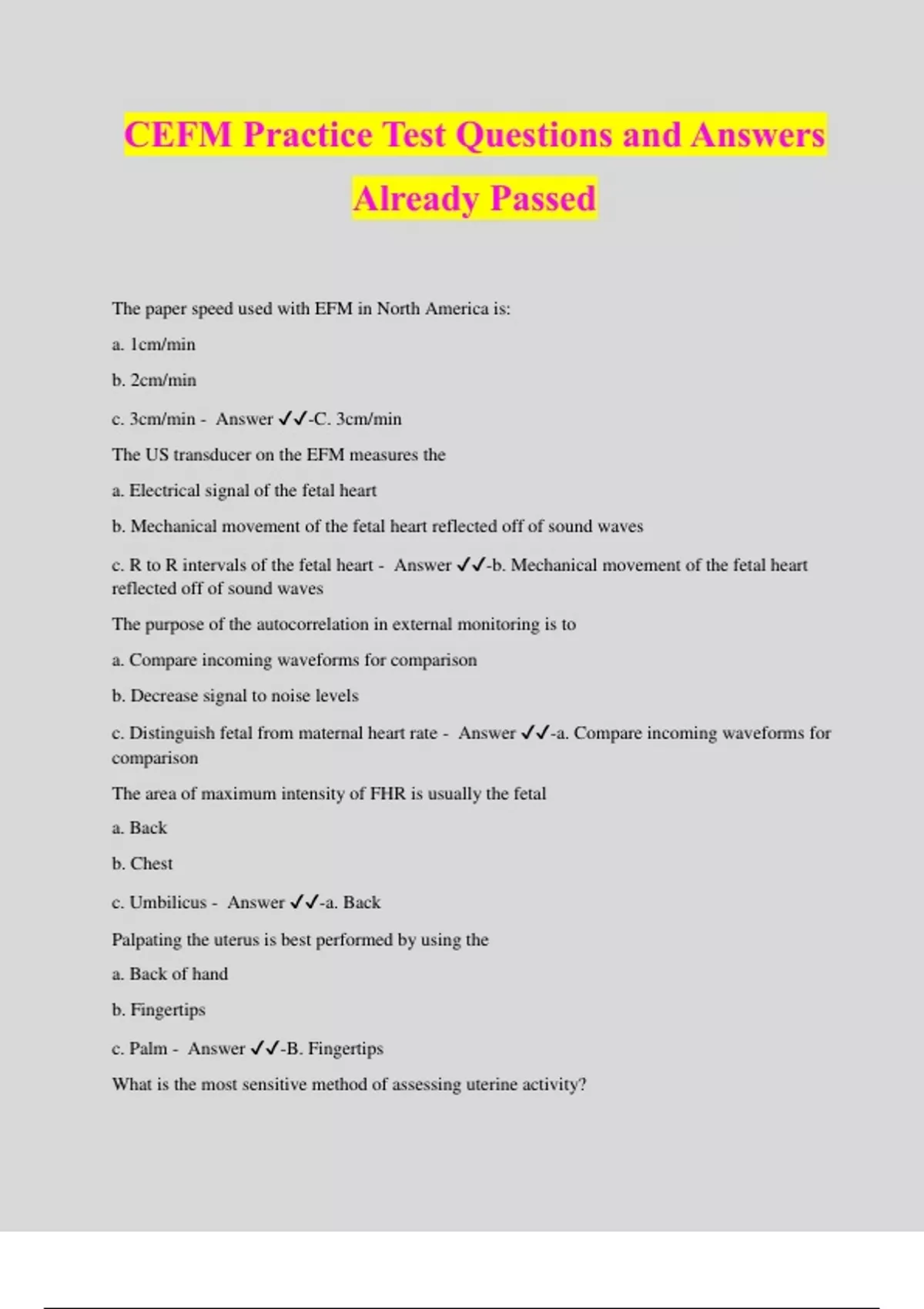 CEFM Practice Test Questions and Answers Already Passed The paper speed used with EFM in North America is: a. 1cm/min b. 2cm/min c. 3cm/min - Answer ️️ -C. 3cm/min The US transducer on the EFM measures the a. Electrical signal of the fetal heart b. Mechanical movement of the fetal heart reflected off of sound waves c. R to R intervals of the fetal heart - Answer ️️ -b. Mechanical movement of the fetal heart reflected off of sound waves The purpose of the autocorrelation in external monitoring is to a. Compare incoming waveforms for comparison b. Decrease signal to noise levels c. Distinguish fetal from maternal heart rate - Answer ️️ -a. Compare incoming waveforms for comparison The area of maximum intensity of FHR is usually the fetal a. Back b. Chest c. Umbilicus - Answer ️️ -a. Back Palpating the uterus is best performed by using the a. Back of hand b. Fingertips c. Palm - Answer ️️ -B. Fingertips What is the most sensitive method of assessing uterine activity? a. Intrauterine pressure catheter b. Manual palpation c. Maternal perception - Answer ️️ -a. Intrauterine pressure catheter When educating the patient about fetal monitoring, the most appropriate statement is a. A normal tracing indicates that your baby is well-oxygenated b. A normal tracing indicates that you have a healthy baby c. Continuous fetal monitoring will insure a better outcome for your baby - Answer ️️ -a. A normal tracing indicates that your baby is well-oxygenated In comparison to maternal blood, the affinity of fetal blood for oxygen is a. Higher b. Lower c. The same - Answer ️️ -a. Higher The process that requires energy to accomplish the passage of substances within the intervillous space is a. Active transport b. Diffusion c. Facilitated diffusion - Answer ️️ -a. Active transport The umbilical vein carries a. Carbon dioxide from the fetus back to the placenta b. Deoxygenated blood from the fetus to the placenta c. Oxygenated blood from the placenta to the fetus - Answer ️️ -c. Oxygenated blood from the placenta to the fetus Fetal hypoxia is best described as a condi