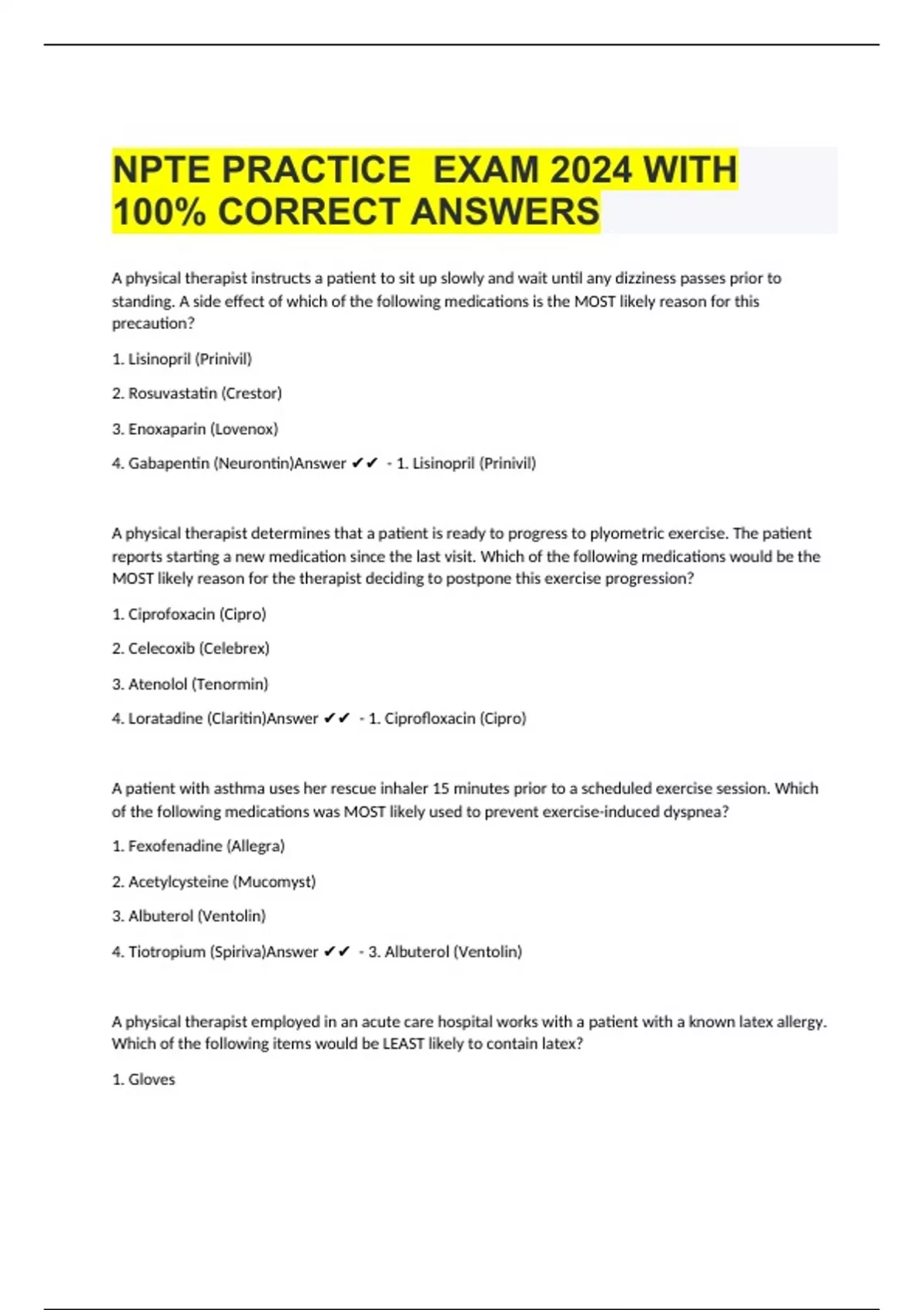 A physical therapist instructs a patient to sit up slowly and wait until any dizziness passes prior to standing. A side effect of which of the following medications is the MOST likely reason for this precaution? 1. Lisinopril (Prinivil) 2. Rosuvastatin (Crestor) 3. Enoxaparin (Lovenox) 4. Gabapentin (Neurontin)Answer - 1. Lisinopril (Prinivil) A physical therapist determines that a patient is ready to progress to plyometric exercise. The patient reports starting a new medication since the last visit. Which of the following medications would be the MOST likely reason for the therapist deciding to postpone this exercise progression? 1. Ciprofoxacin (Cipro) 2. Celecoxib (Celebrex) 3. Atenolol (Tenormin) 4. Loratadine (Claritin)Answer - 1. Ciprofloxacin (Cipro) A patient with asthma uses her rescue inhaler 15 minutes prior to a scheduled exercise session. Which of the following medications was MOST likely used to prevent exercise-induced dyspnea? 1. Fexofenadine (Allegra) 2. Acetylcysteine (Mucomyst) 3. Albuterol (Ventolin) 4. Tiotropium (Spiriva)Answer - 3. Albuterol (Ventolin) A physical therapist employed in an acute care hospital works with a patient with a known latex allergy. Which of the following items would be LEAST likely to contain latex? 1. Gloves 2. Surgical masks