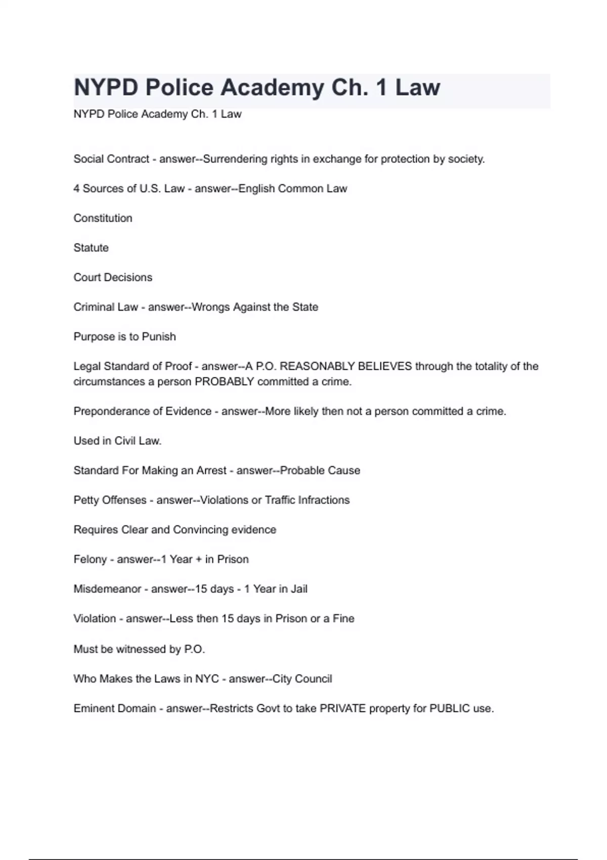 NYPD Police Academy Ch. 1 Law with complete solution