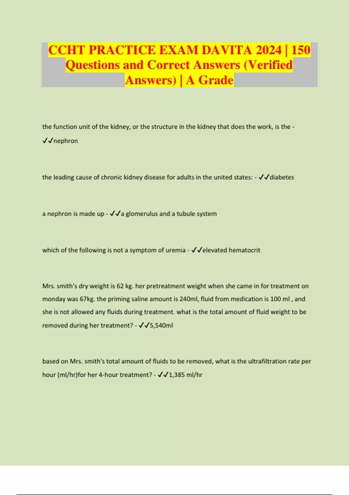 CCHT PRACTICE EXAM DAVITA 2024 | 150 Questions and Correct Answers (Verified Answers) | A Grade