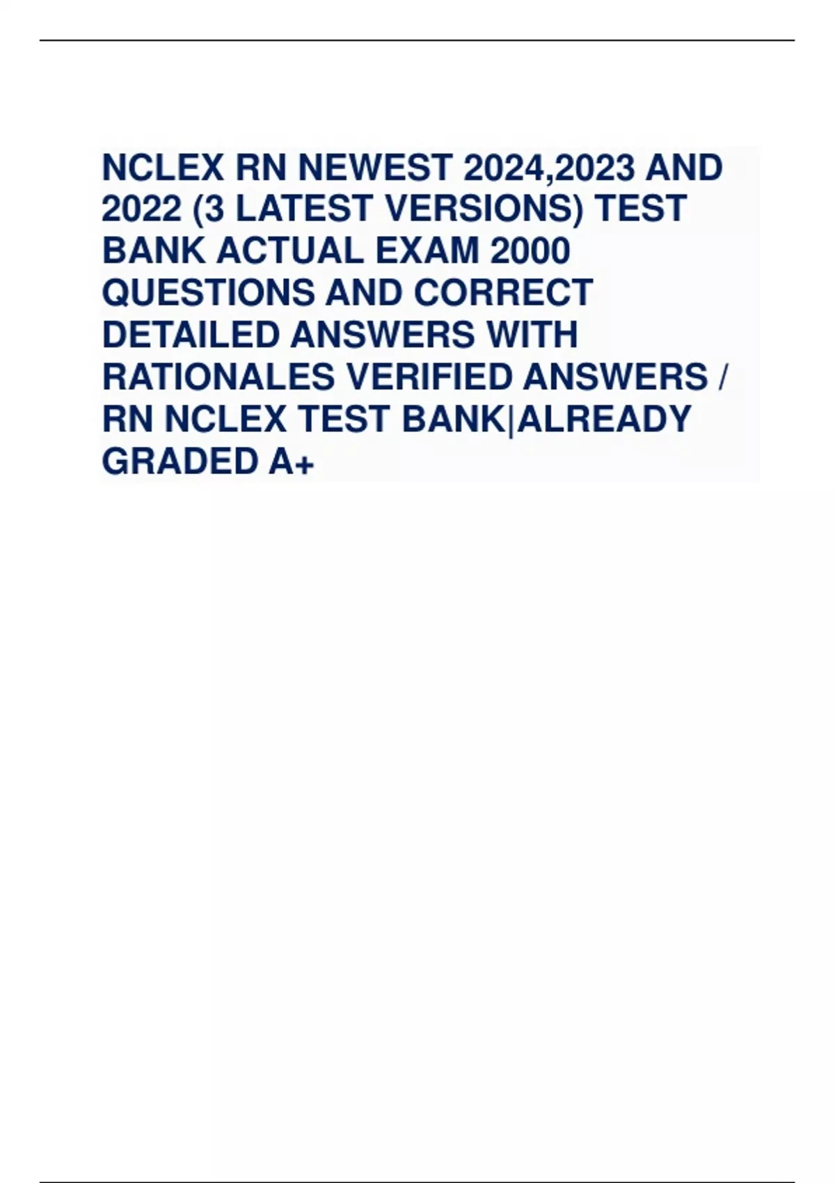 NCLEX RN NEWEST 2024,2023 AND 2022 (3 LATEST VERSIONS) TEST BANK ACTUAL EXAM 2000 QUESTIONS AND CORRECT DETAILED ANSWERS WITH RATIONALES VERIFIED ANSWERS / RN NCLEX TEST BANK|ALREADY GRADED A+
