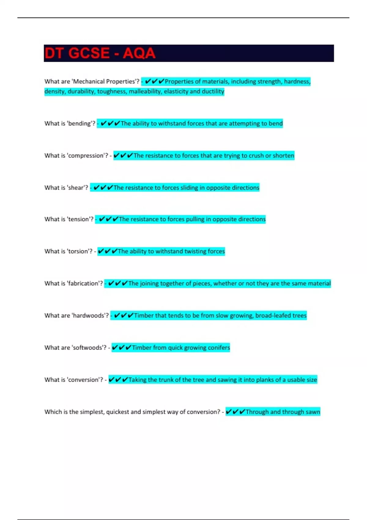 What are 'Mechanical Properties'? - Properties of materials, including strength, hardness, density, durability, toughness, malleability, elasticity and ductility What is 'bending'? - The ability to withstand forces that are attempting to bend What is 'compression'? - The resistance to forces that are trying to crush or shorten What is 'shear'? - The resistance to forces sliding in opposite directions What is 'tension'? - The resistance to forces pulling in opposite directions What is 'torsion'? - The ability to withstand twisting forces What is 'fabrication'? - The joining together of pieces, whether or not they are the same material What are 'hardwoods'? - Timber that tends to be from slow growing, broad-leafed trees What are 'softwoods'? - Timber from quick growing conifers What is 'conversion'? - Taking the trunk of the tree and sawing it into planks of a usable size Which is the simplest, quickest and simplest way of conversion? - Through and through sawn