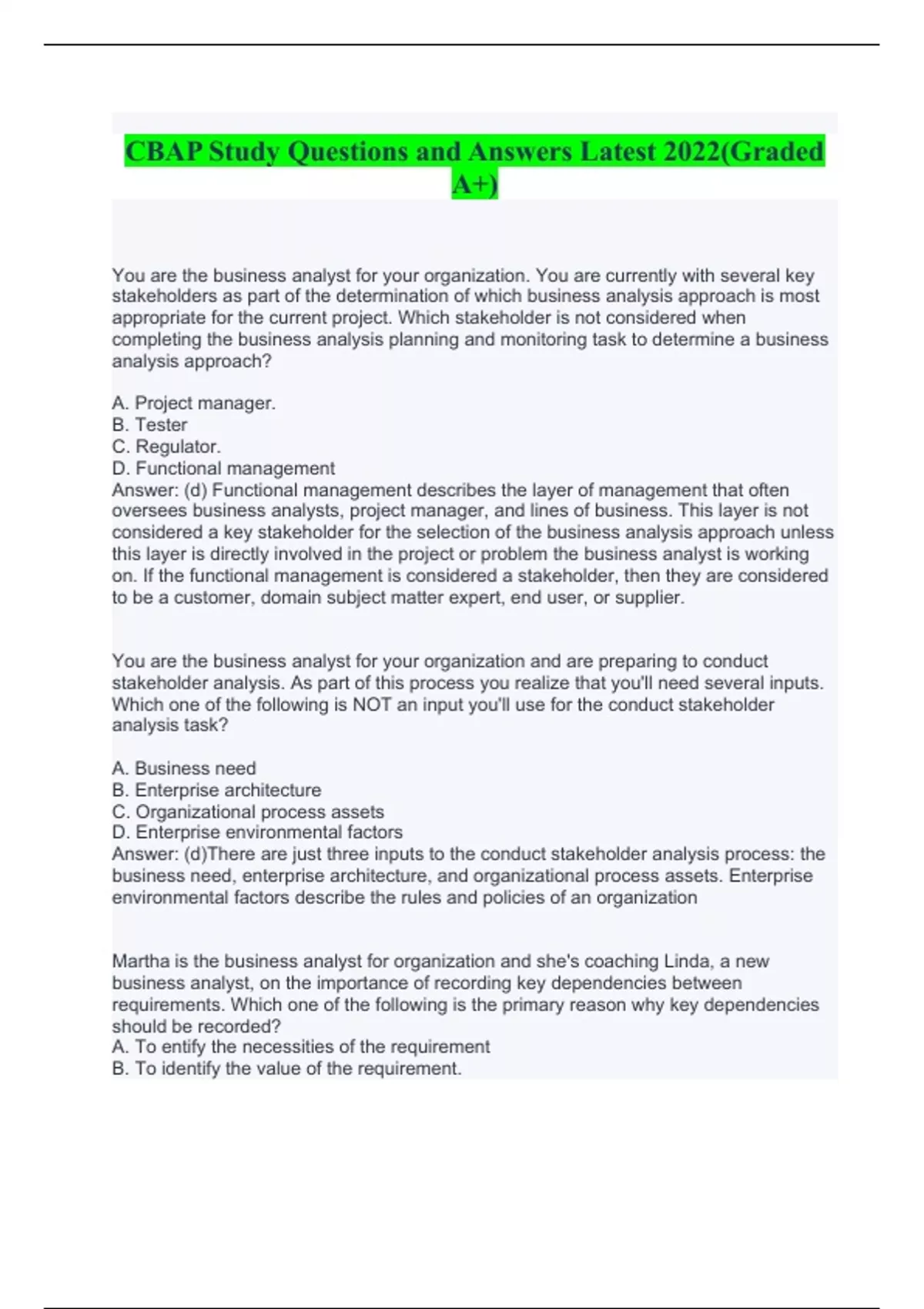 CBAP Study Questions and Answers Latest 2022(Graded A+) You are the business analyst for your organization. You are currently with several key stakeholders as part of the determination of which business analysis approach is most appropriate for the current project. Which stakeholder is not considered when completing the business analysis planning and monitoring task to determine a business analysis approach? A. Project manager. B. Tester C. Regulator. D. Functional management Answer: (d) Functional management describes the layer of management that often oversees business analysts, project manager, and lines of business. This layer is not considered a key stakeholder for the selection of the business analysis approach unless this layer is directly involved in the project or problem the business analyst is working on. If the functional management is considered a stakeholder, then they are considered to be a customer, domain subject matter expert, end user, or supplier. You are the business analyst for your organization and are preparing to conduct stakeholder analysis. As part of this process you realize that you'll need several inputs. Which one of the following is NOT an input you'll use for the conduct stakeholder analysis task? A. Business need B. Enterprise architecture C. Organizational process assets D. Enterprise environmental factors Answer: (d)There are just three inputs to the conduct stakeholder analysis process: the business need, enterprise architecture, and organizational process assets. Enterprise environmental factors describe the rules and policies of an organization Martha is the business analyst for organization and she's coaching Linda, a new business analyst, on the importance of recording key dependencies between requirements. Which one of the following is the primary reason why key dependencies should be recorded? A. To entify the necessities of the requirement B. To identify the value of the requirement. C. To trace the requirement across the project life cycle. D. To Determine who owns the requirement in the project life cycle Answer: (c) Key dependencies and relationships between requirements should be recorded so they can be traced across the project life cycle. Creating and maintaining this information assists the business analyst in sequencing project work activities to design and deploy the capabilities found in the requirements. It also assists the business analyst in correctly allocating requirements to solution components. Elizabeth is a project stakeholder in your project and she is asking for a change in one of the project requirements. Before this change can be approved, you'll need to determine the effect of the change on all other project requirements. What term best describes the examination of the relationships that may be affected by the change in requirement? TraceabilityA. DecompositionB. Integration managementC. Change control process Answer: (a) Traceability facilitates better decision making when it comes to assessing the impact of change requests on a project. There are six tasks that comprise the business analysis planning and monitoring and that must be completed by the business analyst. Which one of the following items is not one of the six tasks that you should complete as a business analyst following the traditional business analyst planning and monitoring approach to a project? Planning the business analysis approachA. Conducting quality assurance processesB. Planning business analysis communicationC. Managing business analysis performance D. Answer: (b) Quality assurance is not one of the six business analyst activities that you'll do in the planning and monitoring domain of business analysis activities. The correct six activities are: the business analysis approach, conducting stakeholder analysis, planning business analysis activities, planning business analysis communication, planning the requirements management process, managing business analysis performance. You are the business analyst for your organization and you're gathering project requirements for a small project to create a simple website for a client. Management requires that you use a tool to trace all requirements throughout the project life cycle even for smaller projects. Based on this smaller project, what type of requirements tracing would you recommend? Coverage matrixA. System matrixB. Roles and Responsibilities matrixC. RACI matrix D. Answer: (a) The coverage matrix technique is specific to the Manage Requirements Traceability task. Basically, a coverage matrix is a table or spreadsheet used to manage and facilitate tracing of requirements. This simple approach is used on simple projects where there are only few requirements or on other projects where traceability is very limited and not too detailed. One of the most important activities you'll do as a business analyst is stakeholder analysis. This process helps you, the project team, and the project manager understand who the stakeholders are, and what their roles in the project will be, their priorities for their requirements and communication demands. When does stakeholder analysis typically occur? During the controlled start phase of the projectA. During project initiationB. Before the project beginsC. As often as needed D. Answer: (a) The business analyst initially performs stakeholder analysis during the controlled start phase of a project, or as part of the pre-project activities. Analysis activities at this point in time focus on key stakeholders who are impacted by the business need and the proposed solution. Juan is the business analyst for his organization and he's performing stakeholder analysis. During this process, Juan wants to create a method to capture the roles and responsibilities for each of the stakeholders. Some of the stakeholders, for example, will be responsible for specific tasks while other stakeholders just need to be kept informed of the progress of the work. Which tool should Juan use