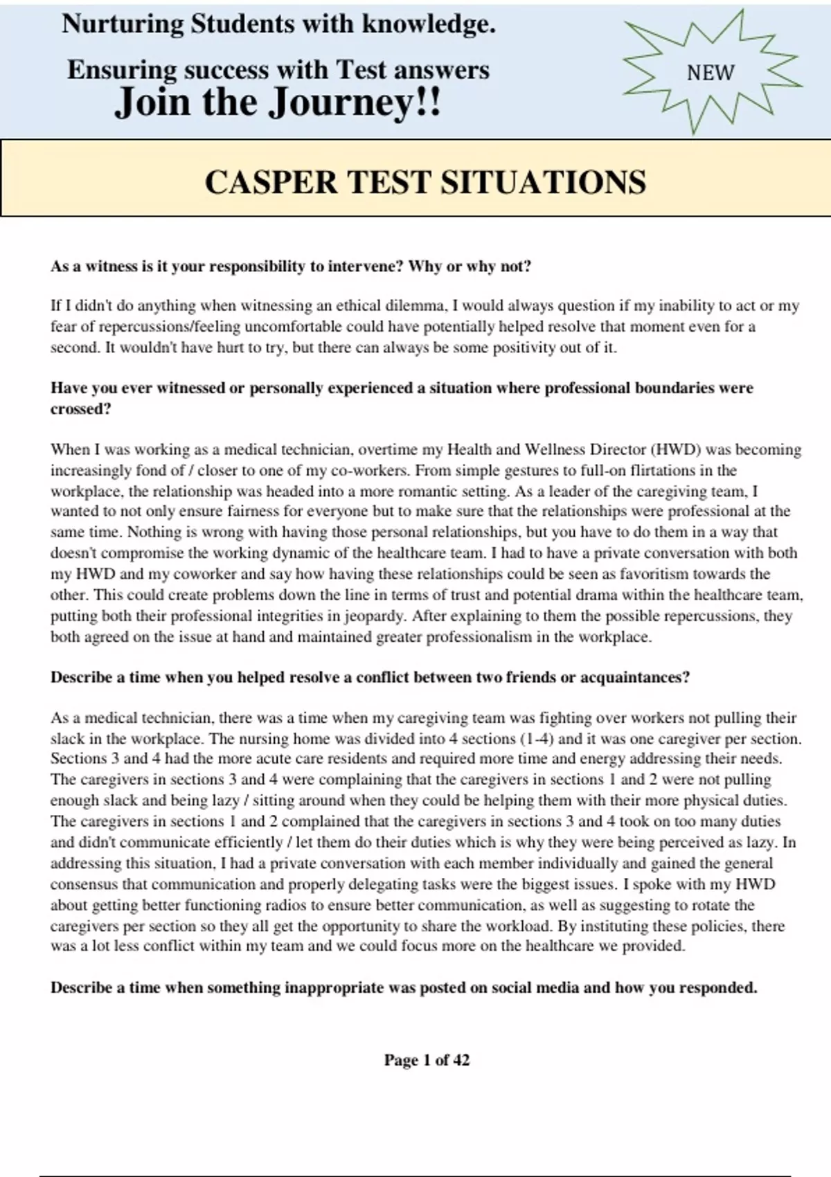 CASPER TEST SITUATIONS As a witness is it your responsibility to intervene? Why or why not? If I didn't do anything when witnessing an ethical dilemma, I would always question if my inability to act or my fear of repercussions/feeling uncomfortable could have potentially helped resolve that moment even for a second. It wouldn't have hurt to try, but there can always be some positivity out of it. Have you ever witnessed or personally experienced a situation where professional boundaries were crossed? When I was working as a medical technician, overtime my Health and Wellness Director (HWD) was becoming increasingly fond of / closer to one of my co-workers. From simple gestures to full-on flirtations in the workplace, the relationship was headed into a more romantic setting. As a leader of the caregiving team, I wanted to not only ensure fairness for everyone but to make sure that the relationships were professional at the same time. Nothing is wrong with having those personal relationships, but you have to do them in a way that doesn't compromise the working dynamic of the healthcare team. I had to have a private conversation with both my HWD and my coworker and say how having these relationships could be seen as favoritism towards the other. This could create problems down the line in terms of trust and potential drama within the healthcare team, putting both their professional integrities in jeopardy. After explaining to them the possible repercussions, they both agreed on the issue at hand and maintained greater professionalism in the workplace. Describe a time when you helped resolve a conflict between two friends or acquaintances? As a medical technician, there was a time when my caregiving team was fighting over workers not pulling their slack in the workplace. The nursing home was divided into 4 sections (1-4) and it was one caregiver per section. Sections 3 and 4 had the more acute care residents and required more time and energy addressing their needs. The caregivers in sections 3 and 4 were complaining that the caregivers in sections 1 and 2 were not pulling enough slack and being lazy / sitting around when they could be helping them with their more physical duties. The caregivers in sections 1 and 2 complained that the caregivers in sections 3 and 4 took on too many duties and didn't communicate efficiently / let them do their duties which is why they were being perceived as lazy. In addressing this situation, I had a private conversation with each member individually and gained the general consensus that communication and properly delegating tasks were the biggest issues. I spoke with my HWD about getting better functioning radios to ensure better communication, as well as suggesting to rotate the caregivers per section so they all get the opportunity to share the workload. By instituting these policies, there was a lot less conflict within my team and we could focus more on the healthcare we provided. Describe a time when something inappropriate was posted on social media and how you responded