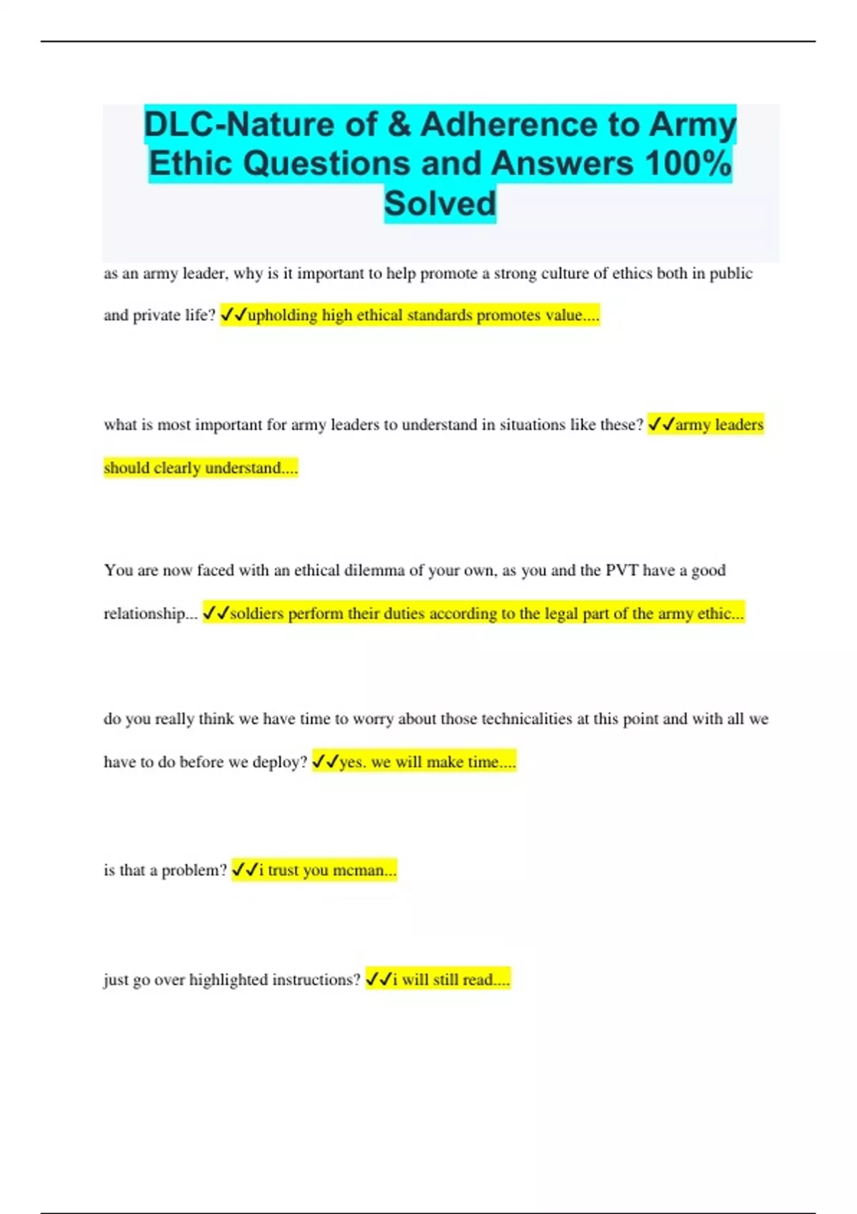 DLC-Nature of & Adherence to Army Ethic Questions and Answers 100% Solved as an army leader, why is it important to help promote a strong culture of ethics both in public and private life? upholding high ethical standards promotes value.... what is most important for army leaders to understand in situations like these? army leaders should clearly understand.... You are now faced with an ethical dilemma of your own, as you and the PVT have a good relationship... soldiers perform their duties according to the legal part of the army ethic... do you really think we have time to worry about those technicalities at this point and with all we have to do before we deploy? yes. we will make time.... is that a problem? i trust you mcman... just go over highlighted instructions? i will still read.... private barret couldn't finish his run.... unfortunately, that's not how this work... however this apft score will result in campbell